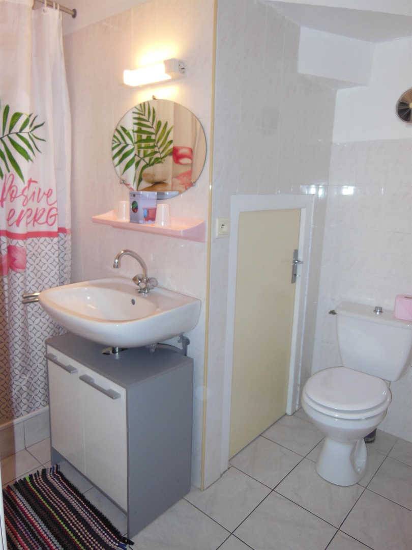 Es gibt ein Badezimmer mit Dusche und WC.