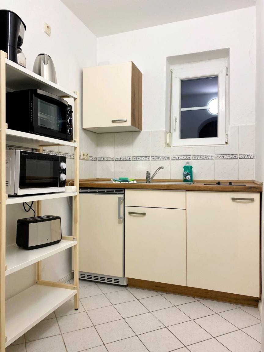 1 Küche die Ausgestattet ist mit: Kühlschrank, Gefrierfach, Mini Backofen, Mikrowelle, Kaffeemaschine, Wasserkocher, Elektroherd, Toaster, Töpfe, Besteck, Geschirr