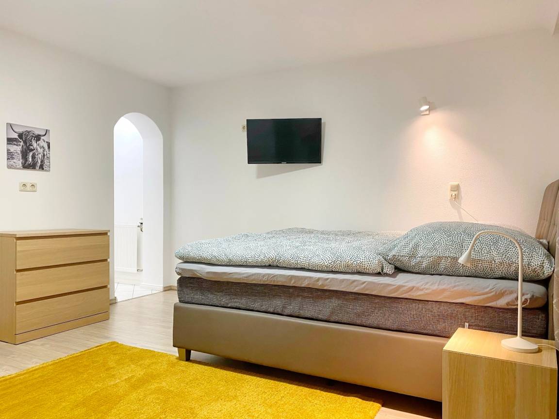 1 Schlafzimmer mit Doppelbett, Bettwäsche, SAT-TV, Balkon
