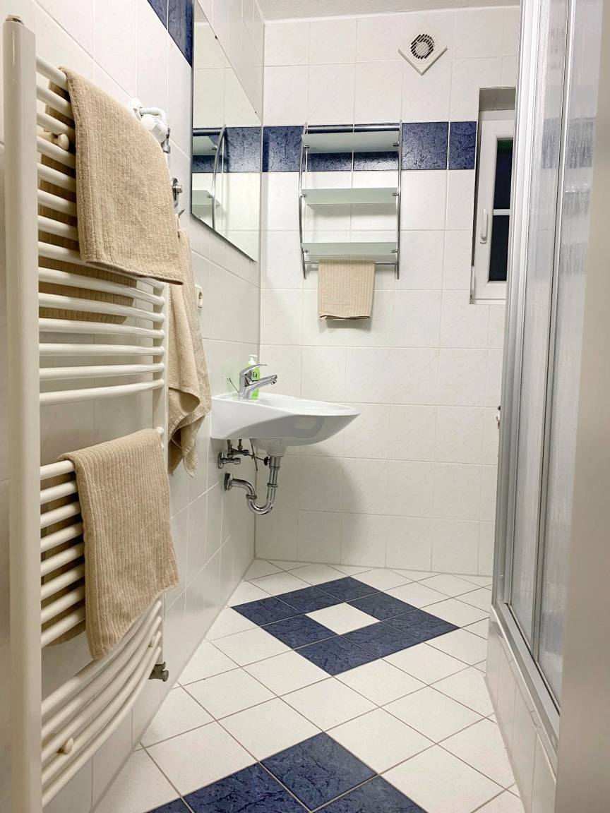 1 Badezimmer mit WC, Dusche und frischen Handtüchern, Haartrockner.
