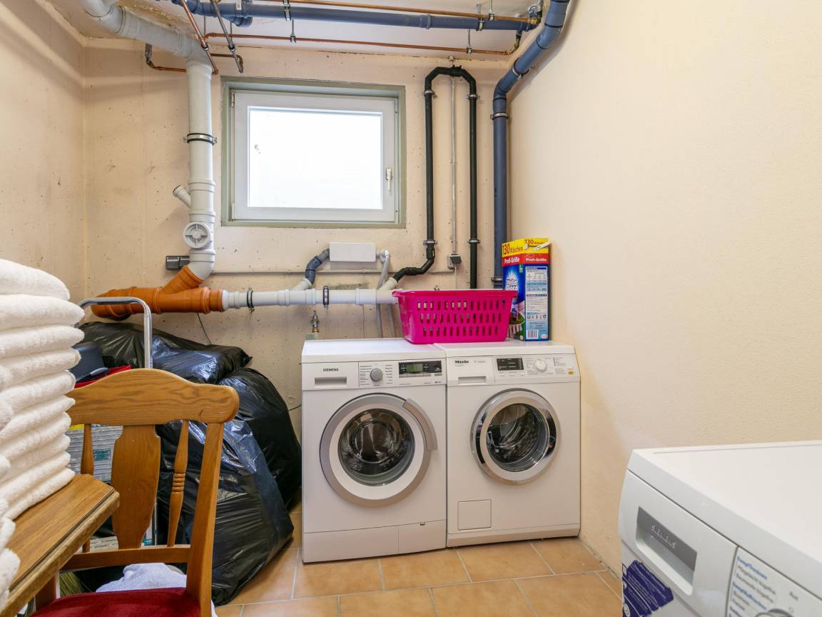 Layout : Parterre: Eingang, offene Küche mit Esstisch(6 Personen), Kochplatte(elektrisch), Kaffeemaschine(Filter), Backofen, Mikrowelle, Geschirrspüler, Kühl-/Gefrierkombination , Wohn/Esszimmer mit TV, Esstisch(10 Personen), Sitzecke , Schlafzimmer mit Doppelbett, TV, Waschbecken , Badezimmer mit Dusche, Waschbecken , Toilette, Wintergarten/Veranda mit Ofen(Holz)
