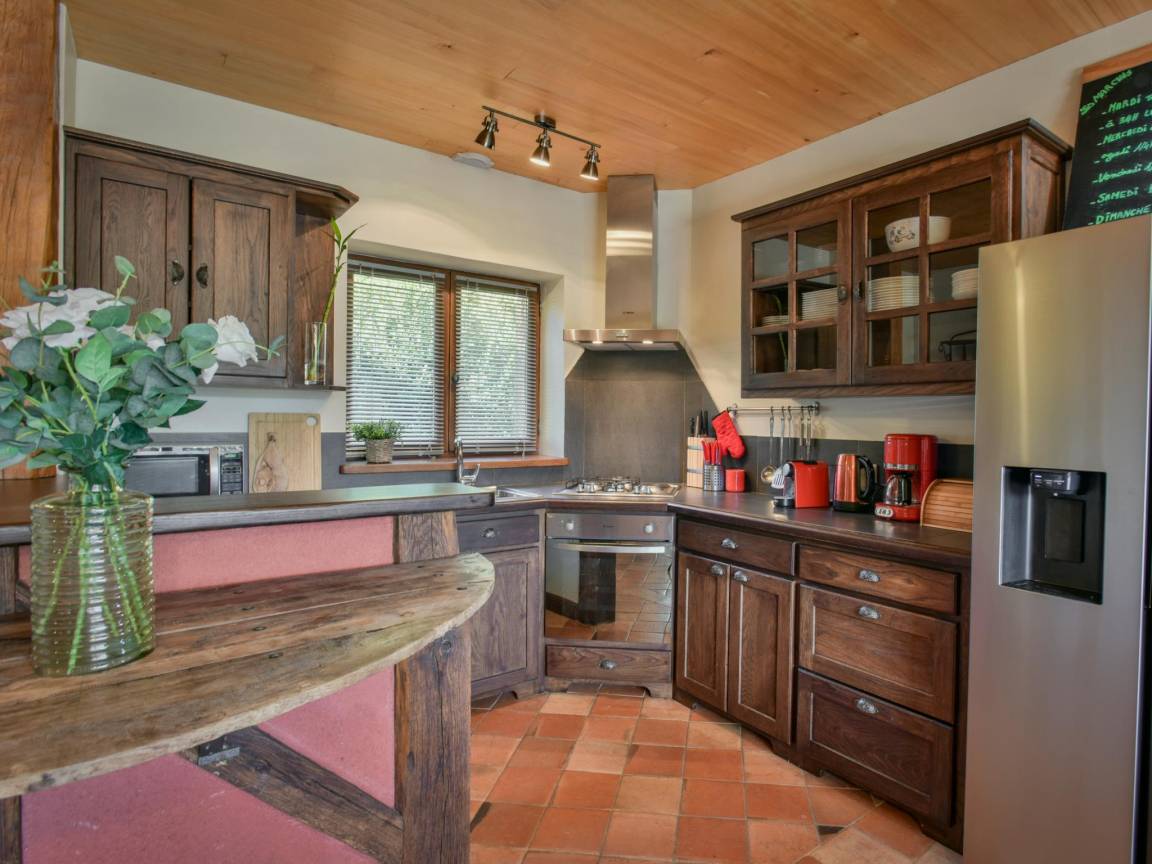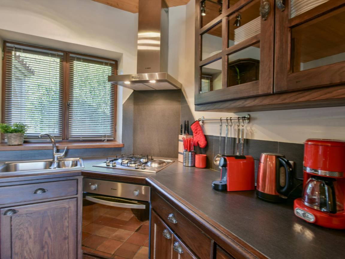 Layout : Parterre: Wohnzimmer mit TV, Ofen(Holz), Sitzecke , Esszimmer mit Esstisch , offene Küche mit Kochherd(4 Kochplatten, Gas), Dunstabzugshaube, Kaffeemaschine(Filter, nespresso cups), Backofen, Mikrowelle, Geschirrspüler, Kühl-/Gefrierkombination , Schlafzimmer mit Doppelbett(160 x 200 cm) , Badezimmer mit Dusche, Waschbecken , Toilette, Balkon oder Terrasse