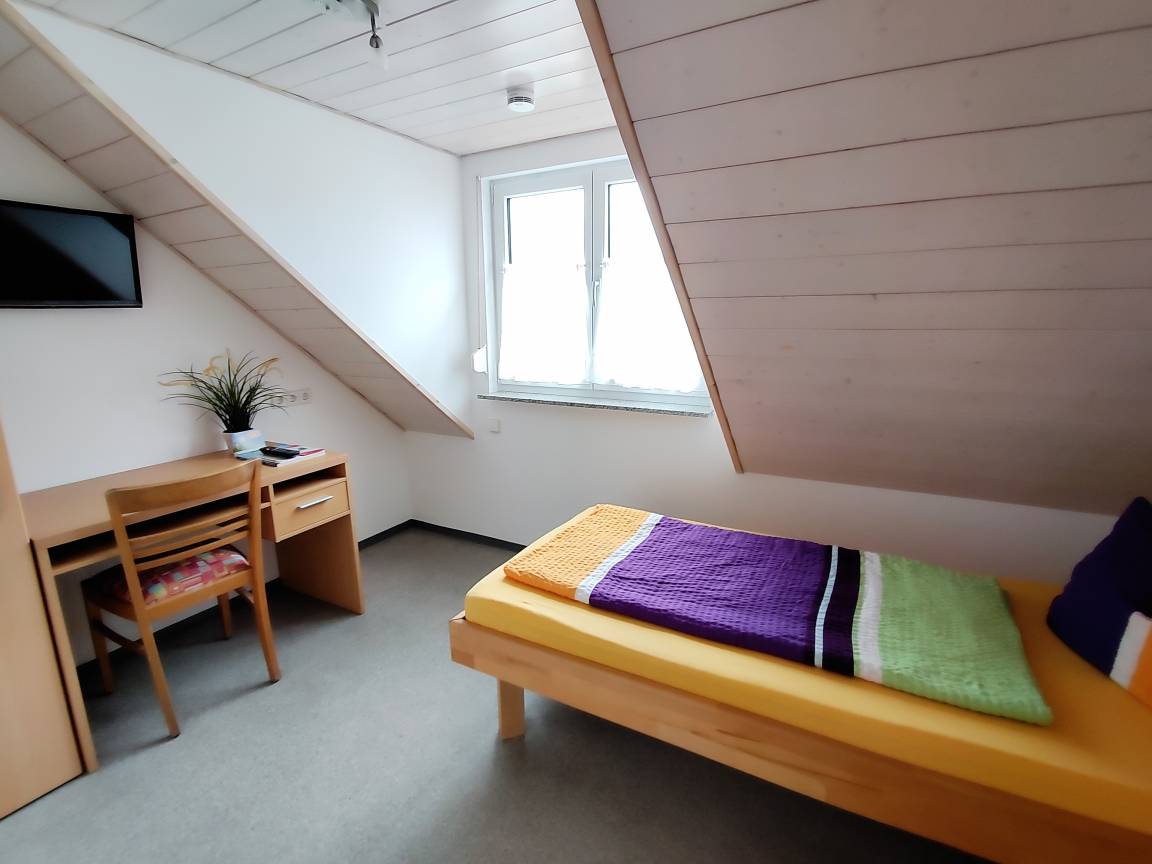 Das Einzelzimmer ist ausgestattet mit Einzelbett, Schreibtisch, DU / WC und WLAN.