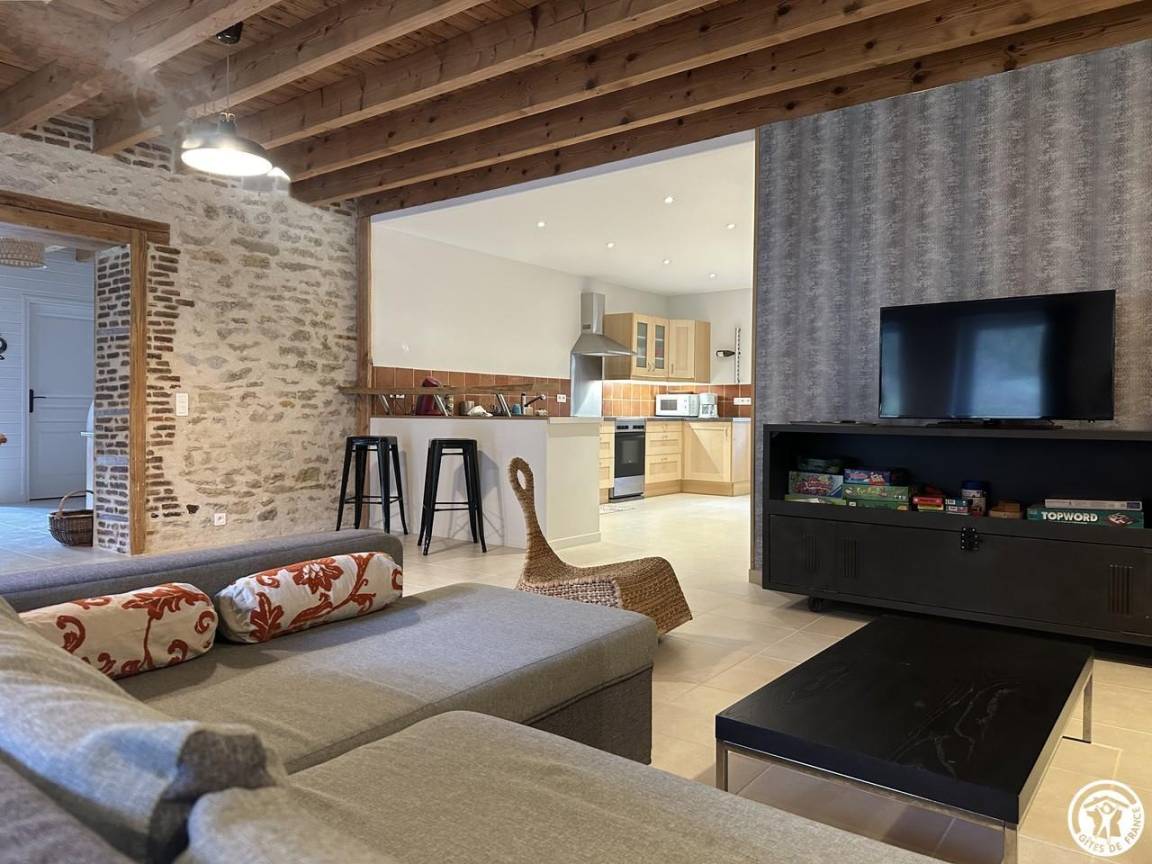 Dachbalken und Sichtstein verleihen dem Ferienhaus eine rustikale und warme Atmosphäre mit einem Hauch von Modernität. Die große, helle, zum Wohnzimmer offene Küche lädt zum geselligen Beisammensein ein.