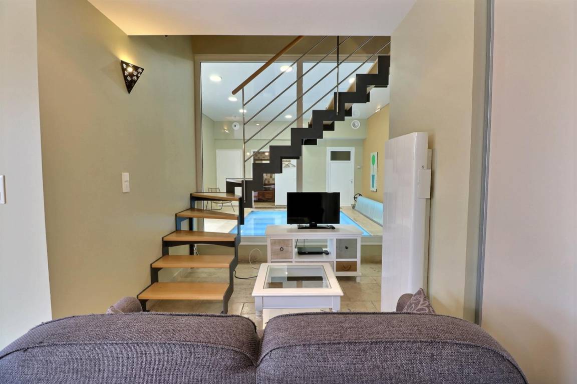 Wohnzimmer mit Lounge-Bereich und Zugang zum Pool, offene Einbauküche, separates WC mit Waschbecken.