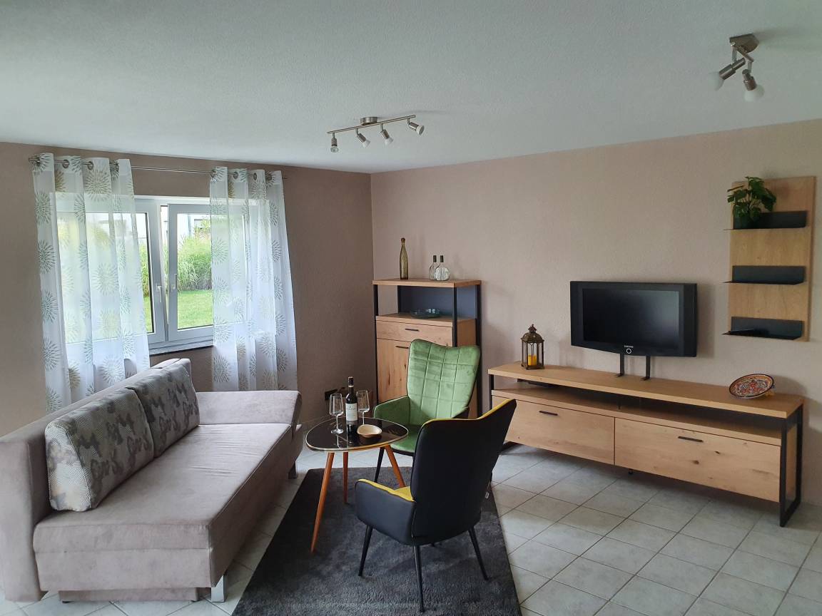 Vom Wohnzimmer, mit Fernseher und kostenfreiem WLAN aus, haben Sie direkten Zugang zur eigenen Terrasse. Hier ist das Rauchen möglich, in der Wohnung ist Rauchverbot und Haustiere sind nicht erlaubt.