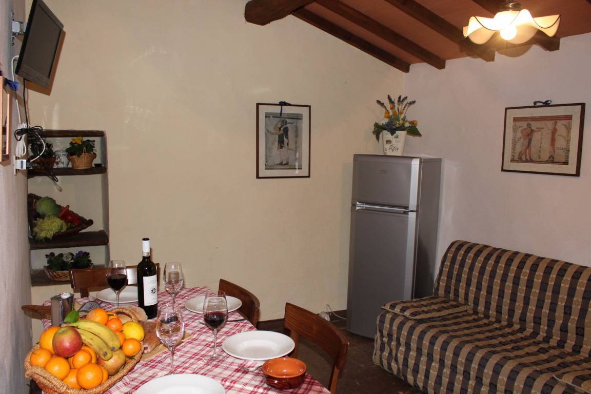 Wohnküche: Esstisch (Personen: 4), Kühlschrank, Tiefkühler, Doppel-Schlafsofa, TV.