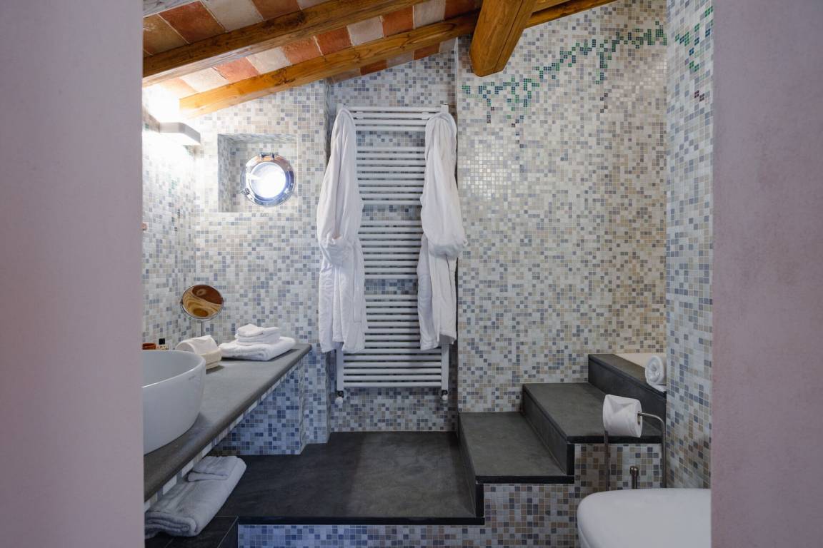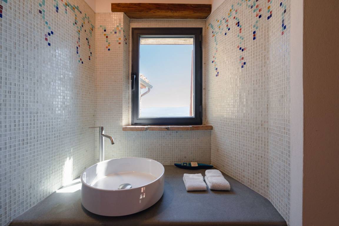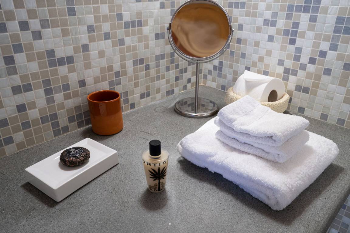Schlafzimmer mit Bad 1: Doppelbett, WiFi Internet, Klimaanlage, tragbarer Ventilator, Waschbecken, WC, Bidet, Dusche, Fön.