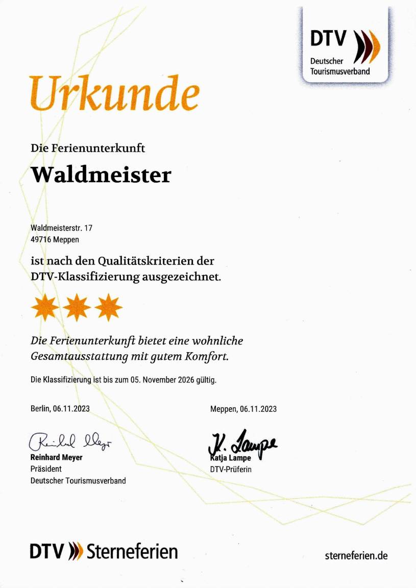 Im November 2023 konnten wir uns erfolgreich nach dem neuen Kriterienkatalog der DTV als 3-Sterne Ferienwohnung rezertifizieren.