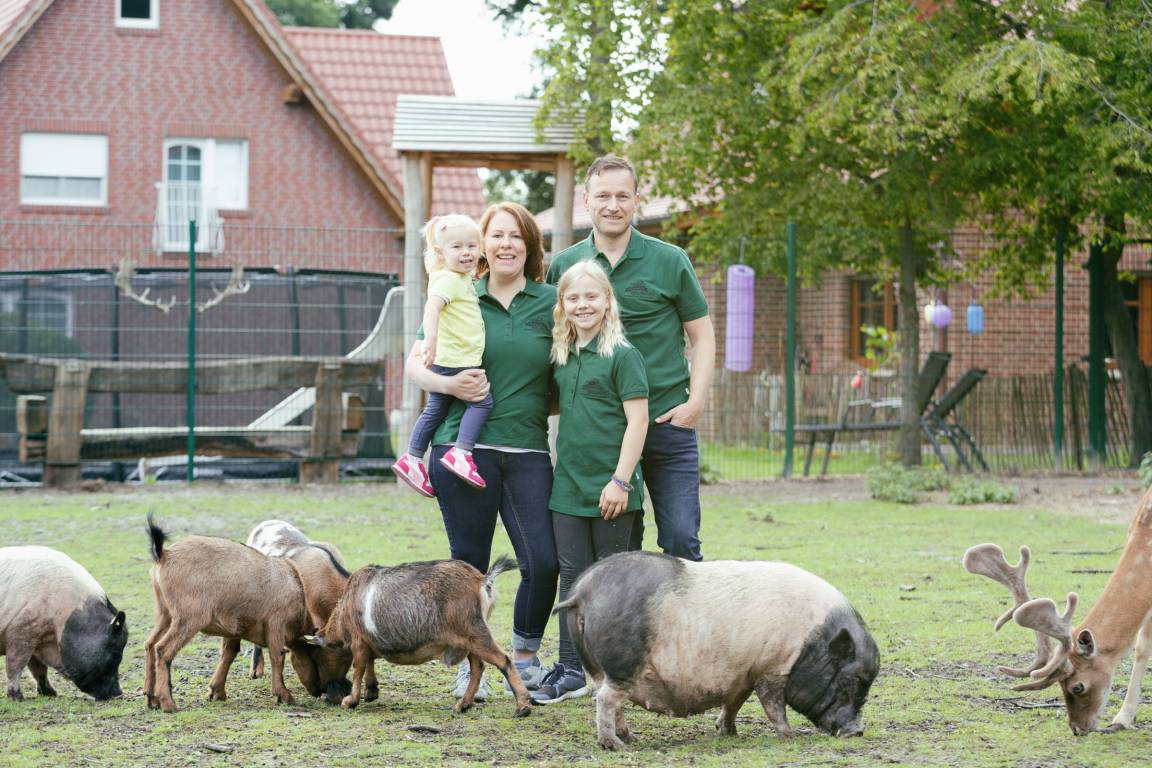 Wir bewirtschaften einen ehemaligen Bauernhof mit eigener Kleintierhaltung mit Damwild/Rehe, Bergziegen, Hängebauchschweine, Hühner, Miniaturesel, Kaninchen, Katzen und Pferden/Ponys.