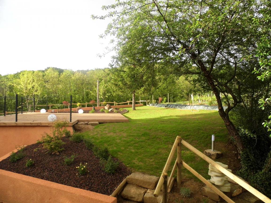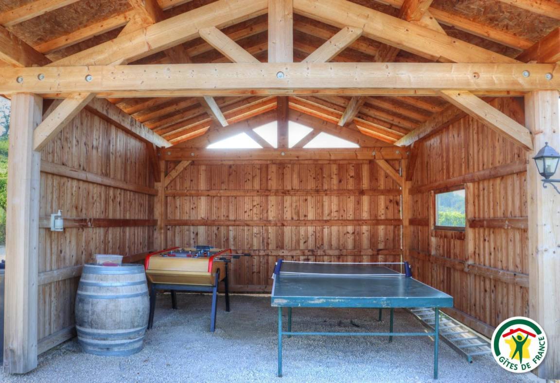 Erdgeschoss: Küche mit Klimaanlage (mit Heizfunktion). Obergeschoss: 1 Schlafzimmer (1 Bett 180 x 200 cm oder 2 Betten 90 x200 cm), Bad mit Dusche/WC. Zusätzliche Schlafmöglichkeit für 1 weitere Person (1 zusätzliches Bett 90 x 190 cm). Boule-Plätze, Tischtennisplatte, Rutsche, Schaukel und Tischfußball. Gemeinsame Nutzung des Gartens mit 3 anderen Ferienunterkünften. Zugang über einen befahrbaren, 150 m langen Steinweg.