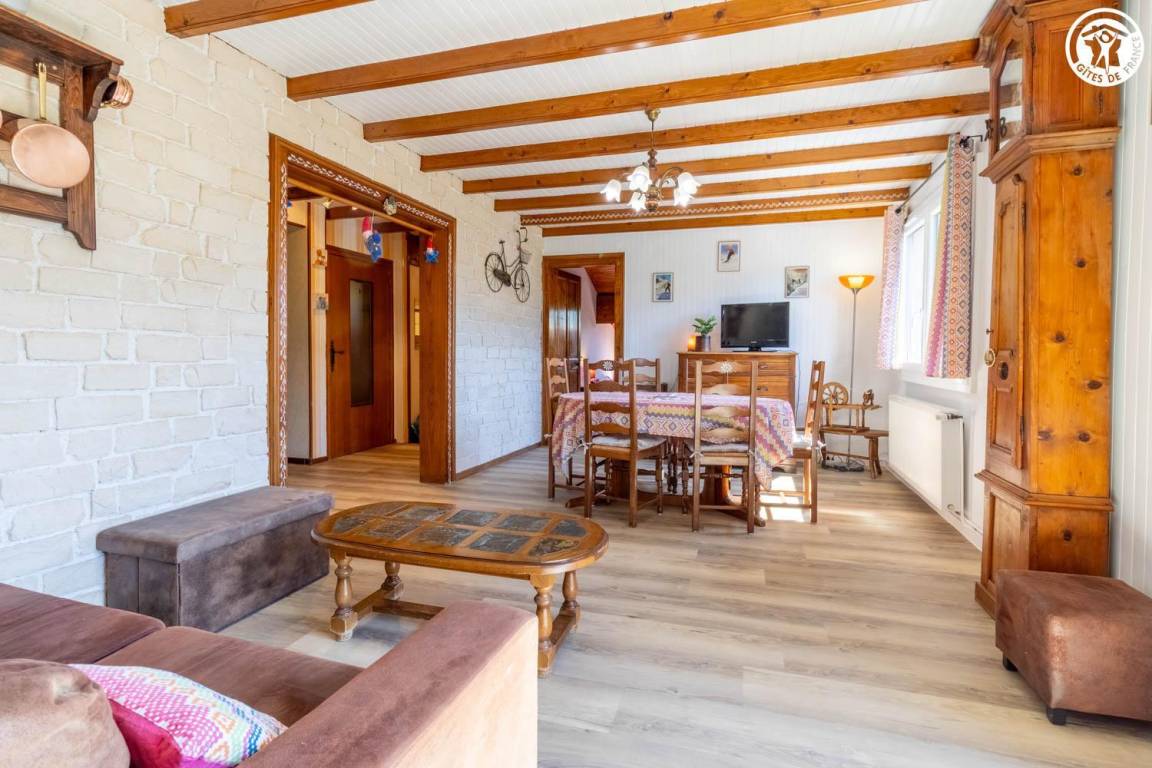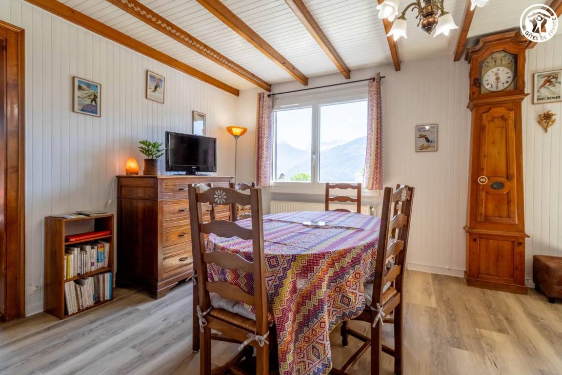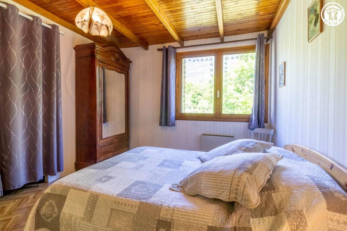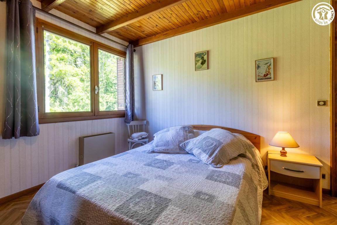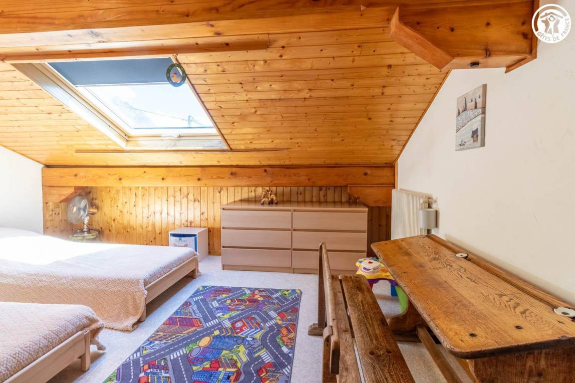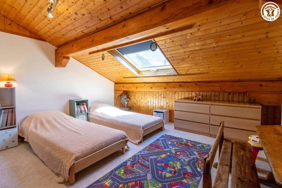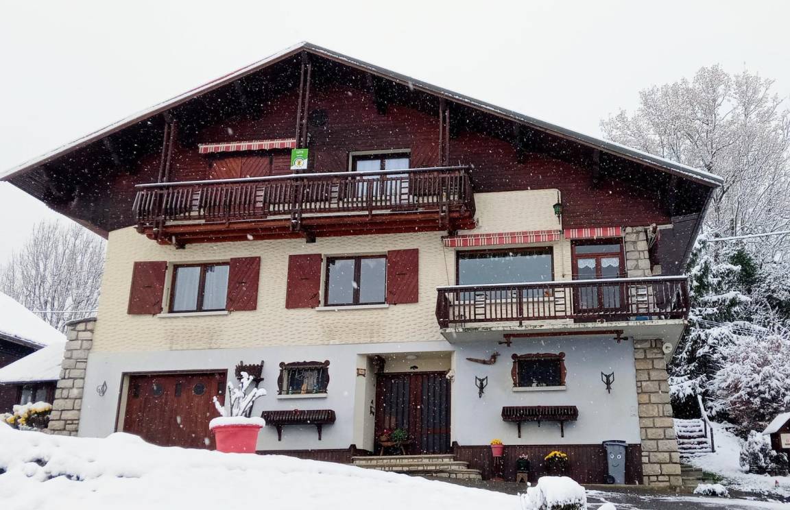 Im Haus des Eigentümers, im 2. Stock (gemeinsamer Eingang und gemeinsame Innentreppe). Wohnung: Wohnküche mit Balkon, 3 Schlafzimmer (1 Doppelbett 140x190 cm + 1 Holz-Kinderbett 60x120 cm / 1 Doppelbett 140x190 cm / 2 Einzelbetten 80x190 cm), Badezimmer (Dusche, Waschmaschine), Toilette mit Waschbecken. Gemeinsam mit dem Eigentümer genutztes, nicht eingezäuntes Grundstück mit möbliertem Essbereich. Ski- und Fahrradaufbewahrung. Privatparkplatz auf dem Grundstück.