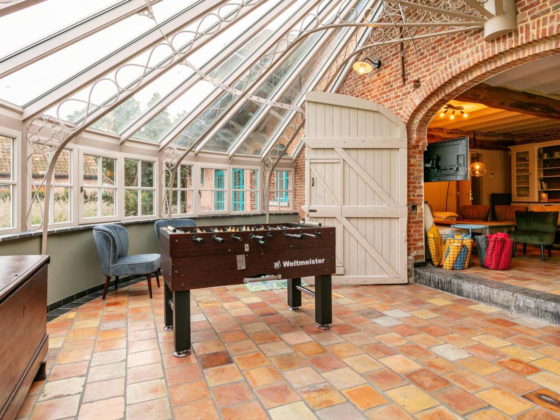Layout : Parterre: offene Küche mit Kochplatte(4 Kochplatten, Induktion), Wasserkocher, Kaffeemaschine(Filter), Backofen, Geschirrspüler, 2x Kühl-/Gefrierkombination , Wohn/Esszimmer mit TV(smart TV) , Toilette, Wintergarten mit Tischfußball, Spielzeug
