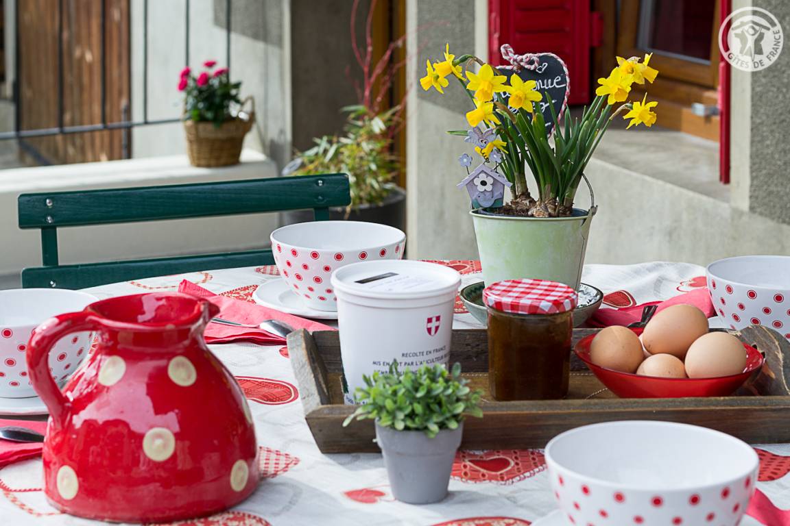 Gite in einem Reihenhaus (völlig unabhängig). Im Erdgeschoss: Wohnküche, Wohnzimmer, 1 Schlafzimmer (1 Doppelbett 140 x 190 cm), Duschbad, separates WC. Im 1. Stock: 2 Schlafzimmer (2 Einzelbetten 80 x 200 cm kombinierbar zu 1 Doppelbett 160 x 200 cm / 2 Einzelbetten 80 x 190 cm kombinierbar zu 1 Doppelbett 160 x 190 cm), Dusche Zimmer mit WC. Privater Balkon + Terrasse + Innenhof. Hunde auf Anfrage erlaubt (gegen Gebühr). Skifahren Le Revard/Savoie-Grand-Revard 19 km, La Féclaz/Savoie-Grand-Revard 26 km. Thermen von Aix-les-Bains 8 km. Strand 5 km (Lac du Bourget). Schwimmbad 8km. Golf 6 km. Geschäfte 3 km.