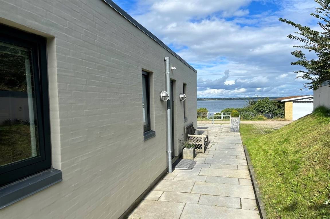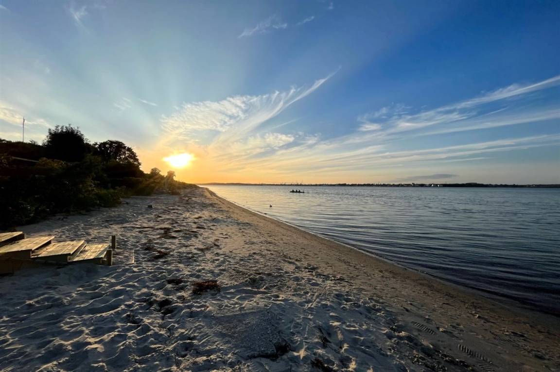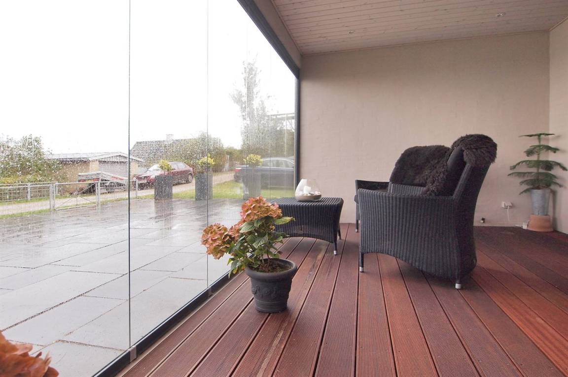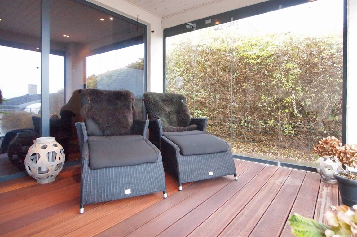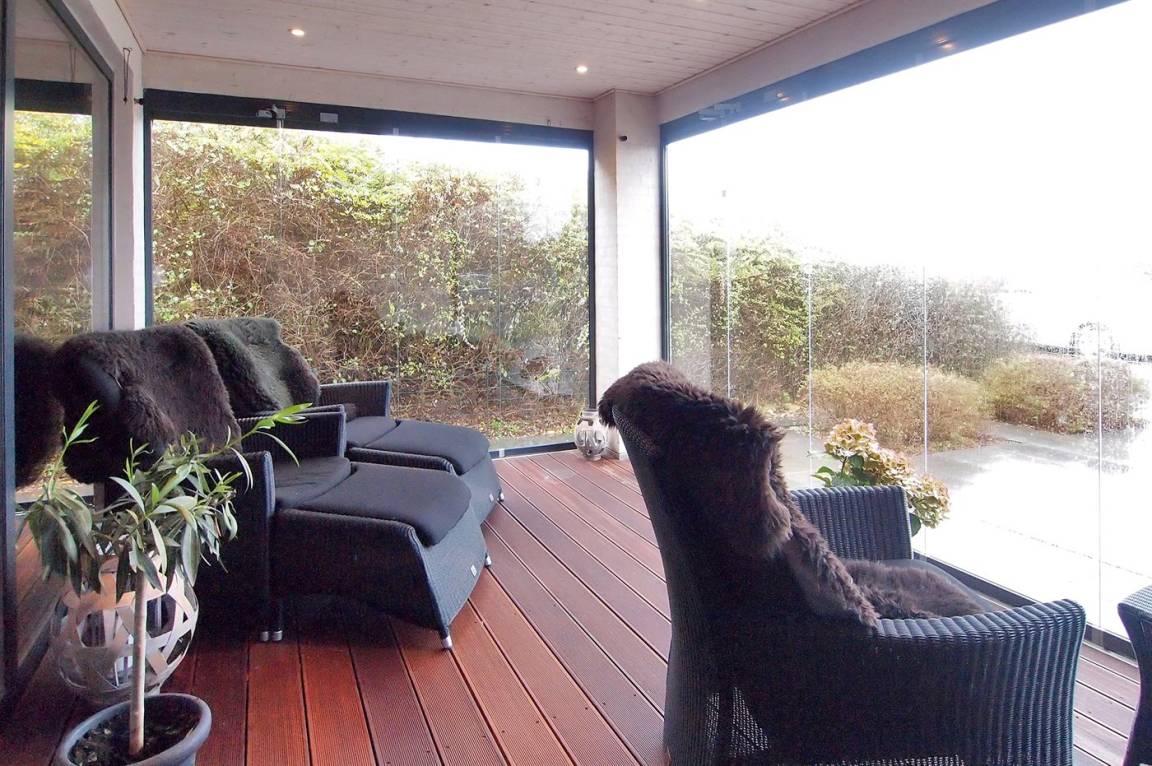 Vom Haus, vom Wintergarten und von der Terrasse aus hast du einen wunderbaren Ausblick über den nördlichen Lillebelt. Die Glasfronten des Wintergartens lassen sich zur Seite schieben, sodass der Wintergarten fast zu einem Teil der Terrasse wird.