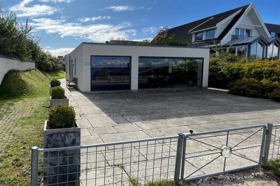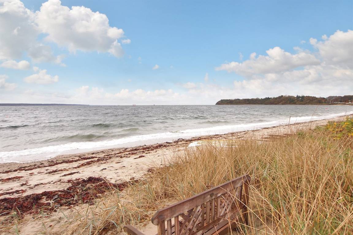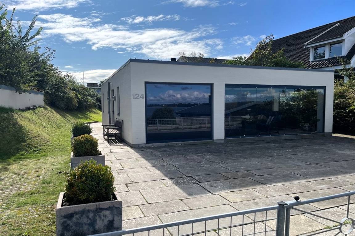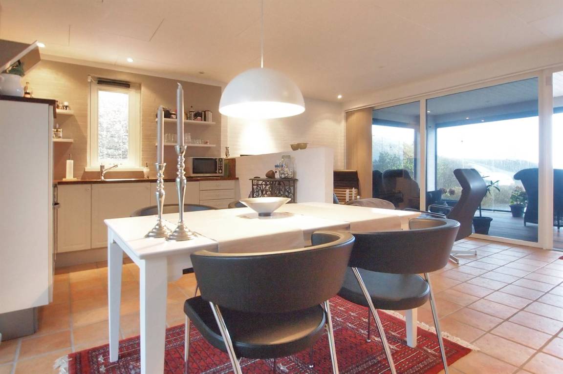 Vom Haus, vom Wintergarten und von der Terrasse aus hast du einen wunderbaren Ausblick über den nördlichen Lillebelt. Die Glasfronten des Wintergartens lassen sich zur Seite schieben, sodass der Wintergarten fast zu einem Teil der Terrasse wird.