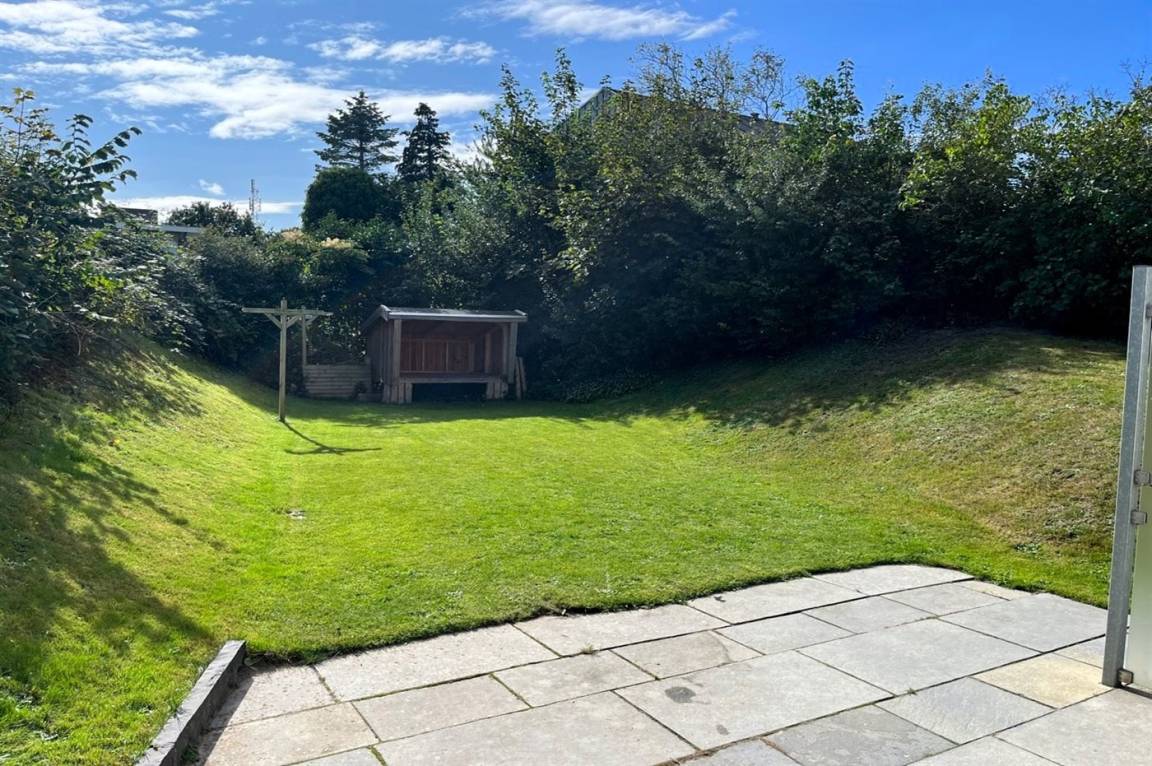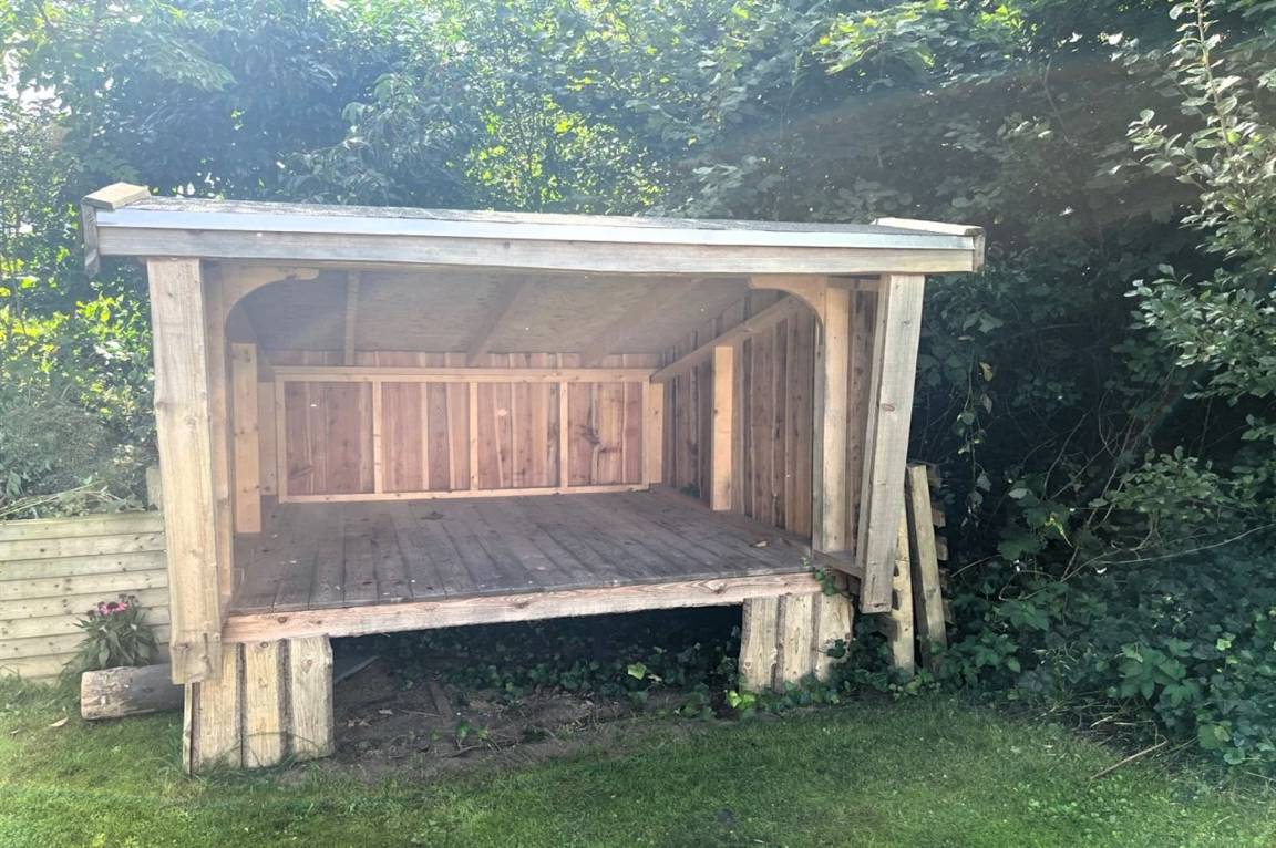 Hinter dem Haus befindet sich ein kleiner Garten mit einer Windschutzhütte.