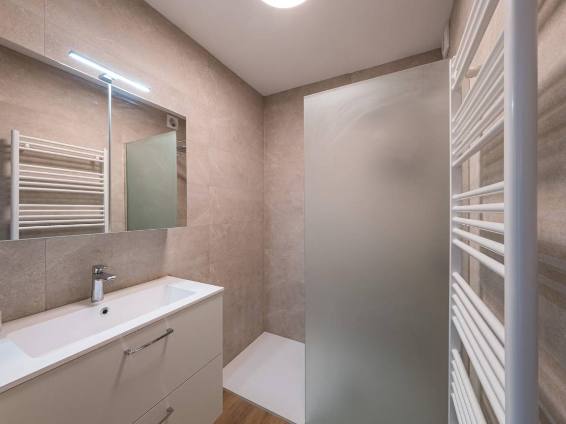 Hausbeschreibung : Wohnung im 5. Stock mit Meerblick und 3 Schlafzimmern: 2 mit Doppelbett und 1 mit Einzelbett, Ausziehbett. Helles Wohnzimmer mit Zugang zur Terrasse mit Meerblick. Voll ausgestattete offene Küche. Luxuriöses Bad mit begehbarer Dusche und separates WC. Zusätzlich südlich ausgerichtete Terrasse hinten. Modern renoviert und zentral nahe Geschäften und ÖV.