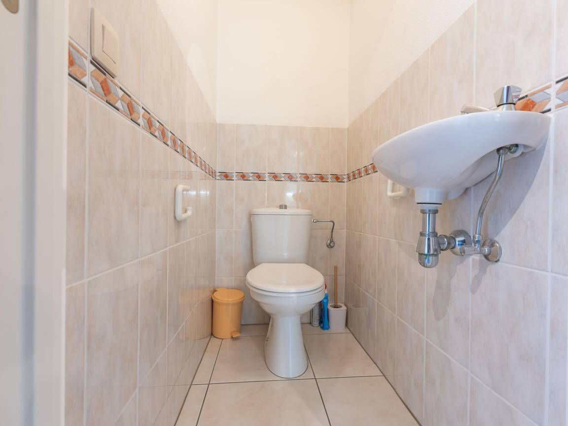 Layout : In der 5. Etage: Wohnzimmer mit Schrankbett 1 Person(Bettdecke, 80 x 180 cm), Doppelschlafcouch(Doppelbettdecke, 160 x 200 cm), TV, Esstisch, Radio , Küche mit Wasserkocher, Kaffeemaschine(Filter), Mikrowelle, Geschirrspüler, Kühlschrank, Kühl-/Gefrierkombination, Zitruspresse , Schlafzimmer mit Doppelbett(Doppelbettdecke, 140 x 200 cm) , Badezimmer mit Badewanne , Toilette, Abstellraum