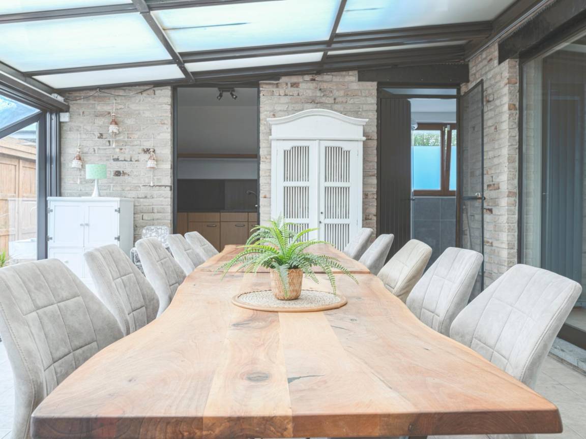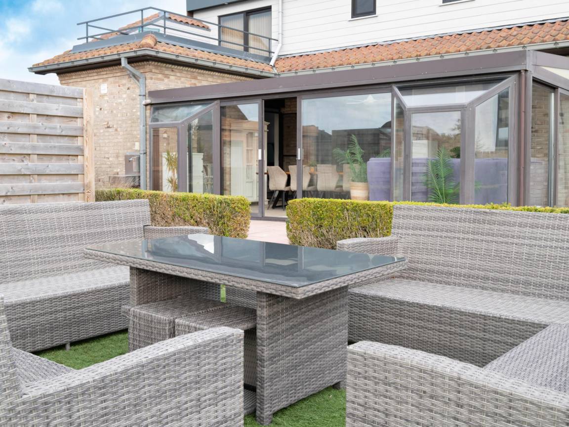 Layout : Parterre: Eingang mit Toilette , Wohnzimmer, Esszimmer, Küche mit Wasserkocher, Kaffeemaschine(Filter), Backofen, Mikrowelle, Geschirrspüler, Kühlschrank, Tiefkühlschrank , Schlafzimmer mit Badezimmer mit Doppelbett(160 x 200 cm), Dusche, 2x Waschbecken , Badezimmer mit Dusche, 2x Waschbecken, Toilette , Wirtschaftsraum mit Wäschetrockner, Waschmaschine , Wintergarten/Veranda mit Esstisch