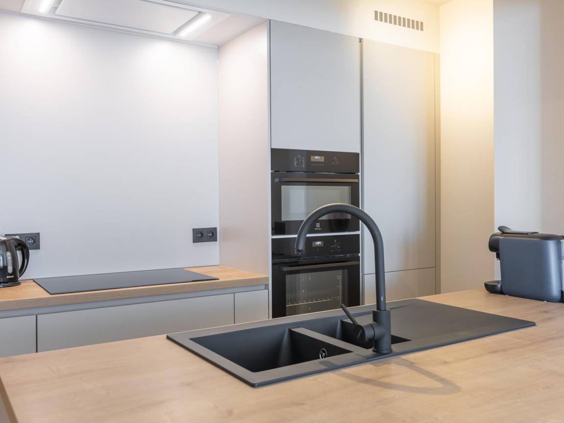 Layout : In der 3. Etage: Wohnzimmer mit Doppelschlafcouch(Doppelbettdecke, 180 x 200 cm), TV , Küche mit Wasserkocher, Kaffeemaschine(Filter), Backofen, Mikrowelle, Geschirrspüler, Kühlschrank, Tiefkühlschrank, Kühl-/Gefrierkombination, Zitruspresse , Badezimmer mit Dusche , Toilette