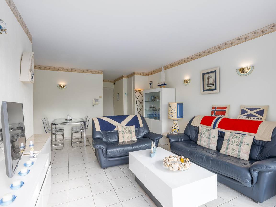Hausbeschreibung : Erdgeschosswohnung mit 1 Schlafzimmer (Doppelbett). Gemütliches Wohnzimmer mit Schlafsofa für 2 und Zugang zu einer großen südseitigen Terrasse mit schönem Blick auf den Teich. Offene Küche und Bad mit Badewanne und WC. Im Villenkomplex Golf Azur, fußläufig zur Promenade, umgeben von Grün. Außenpool geöffnet vom 15.06 bis 15.09.