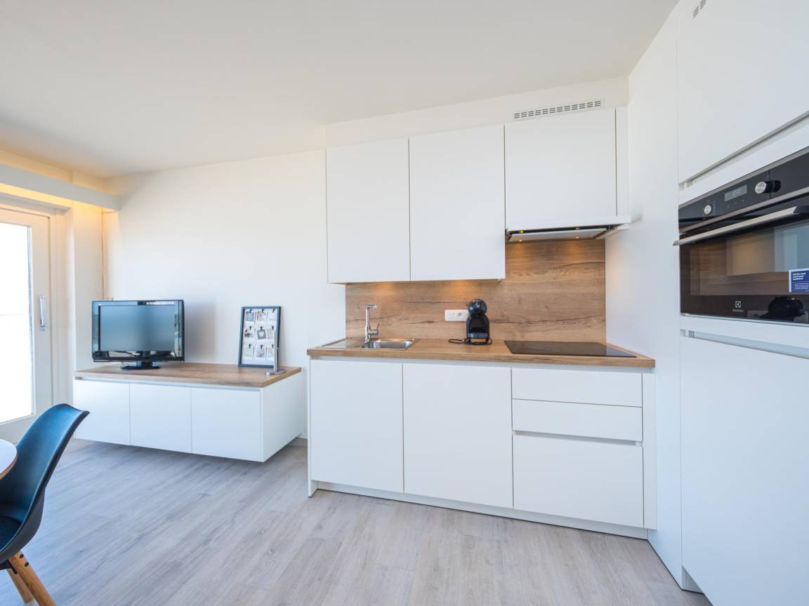 Hausbeschreibung : Vollständig renoviertes Studio im 4. Stock mit Schlafnische (Schrankbett), ideal für einen komfortablen Aufenthalt am Meer. Gemütlicher Wohnbereich mit bodentiefen Fenstern und Zugang zur Terrasse mit schönem Meerblick. Offene, voll ausgestattete Küche und Bad mit Dusche und WC. Ruhig an der Promenade gelegen, fußläufig zu Zentrum, Geschäften, Restaurants und Strand.