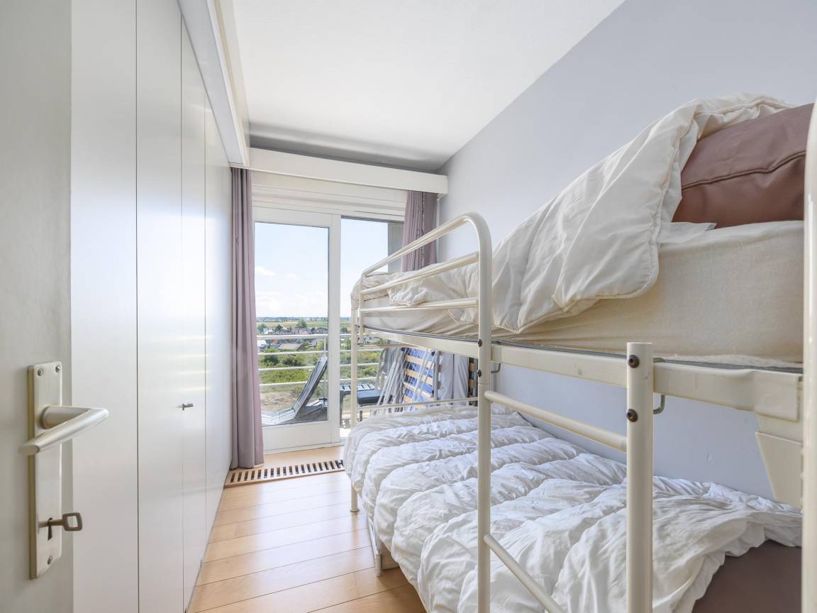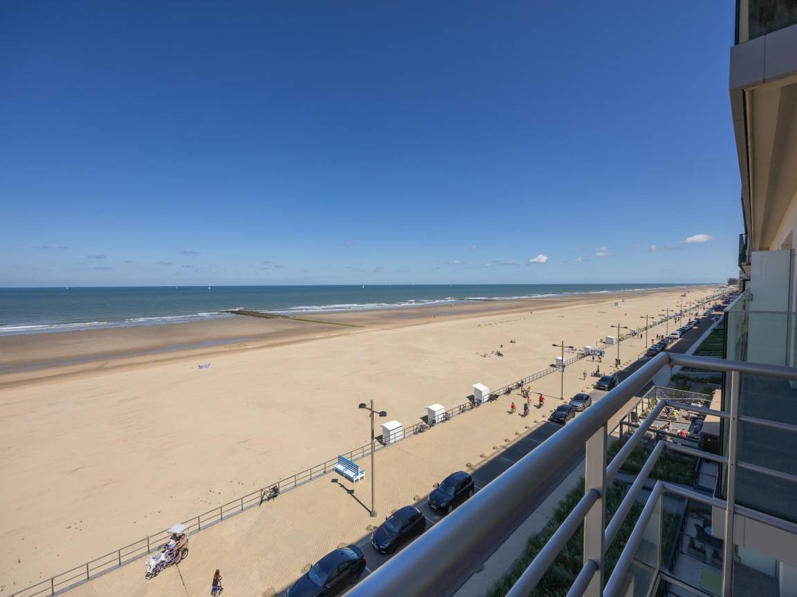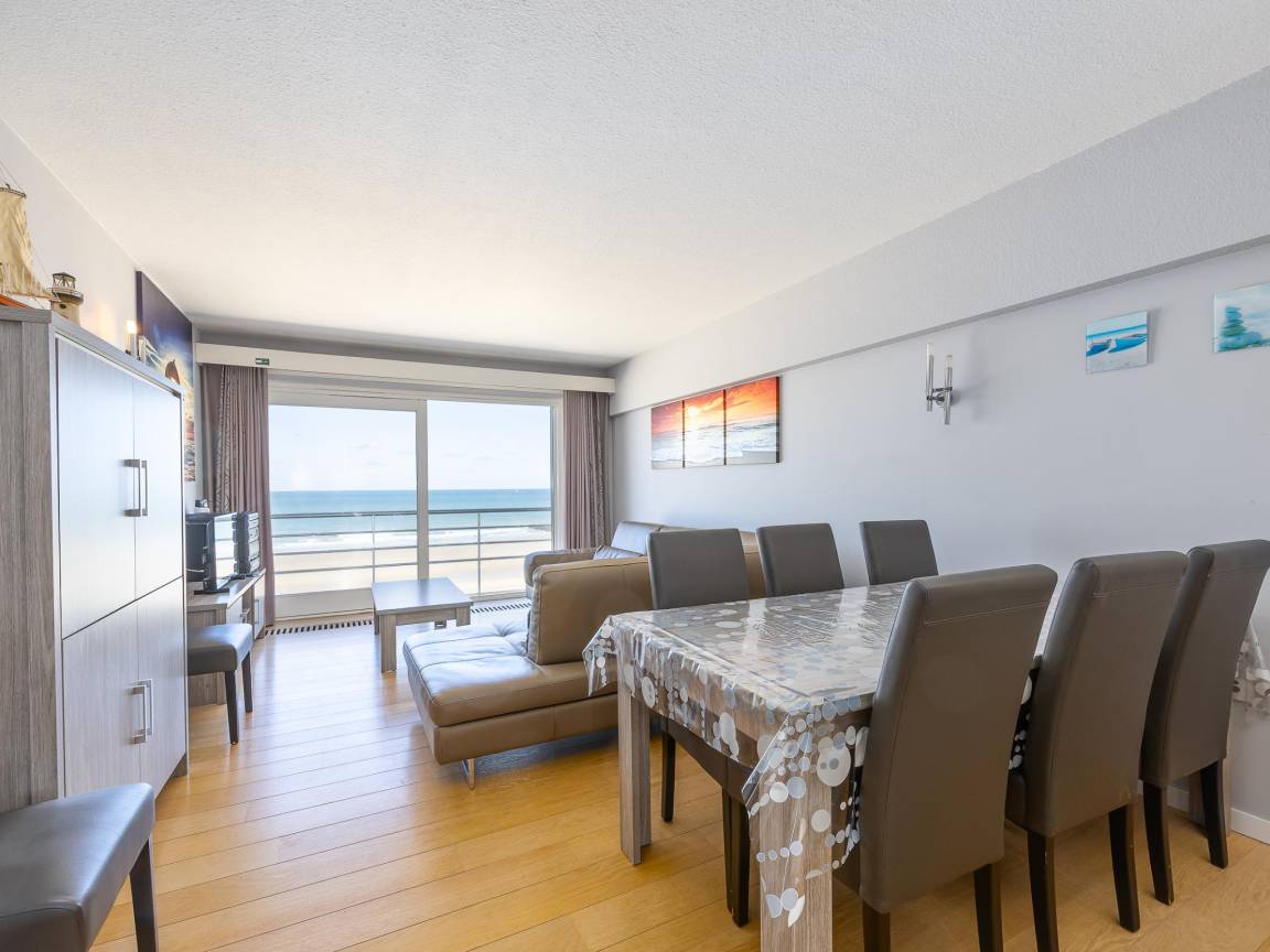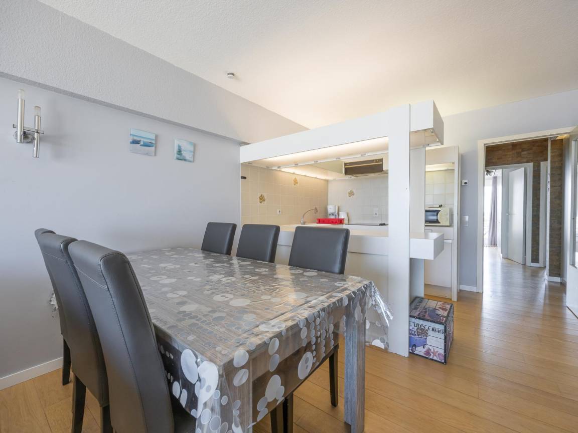 Hausbeschreibung : Geräumige Wohnung im 5. Stock mit atemberaubendem Meerblick. 2 Schlafzimmer: eines mit Doppelbett und eines mit 2 Etagenbetten, beide mit Zugang zur sonnigen Terrasse. Sehr großes Wohnzimmer mit Schlafsofa und bodentiefen Fenstern über die ganze Breite. Voll ausgestattete Küche, Bad mit Badewanne und separates WC. Direkt an der Promenade, Schwimmbad im Gebäude.