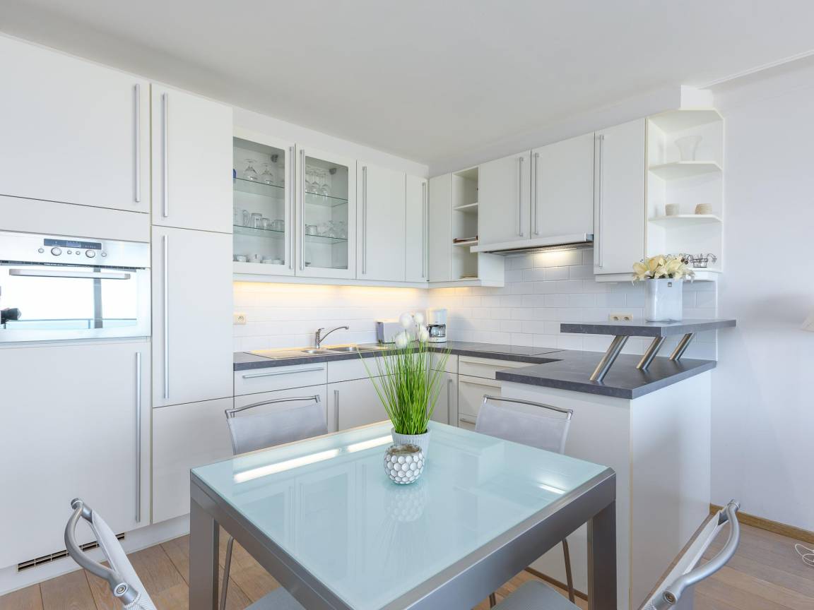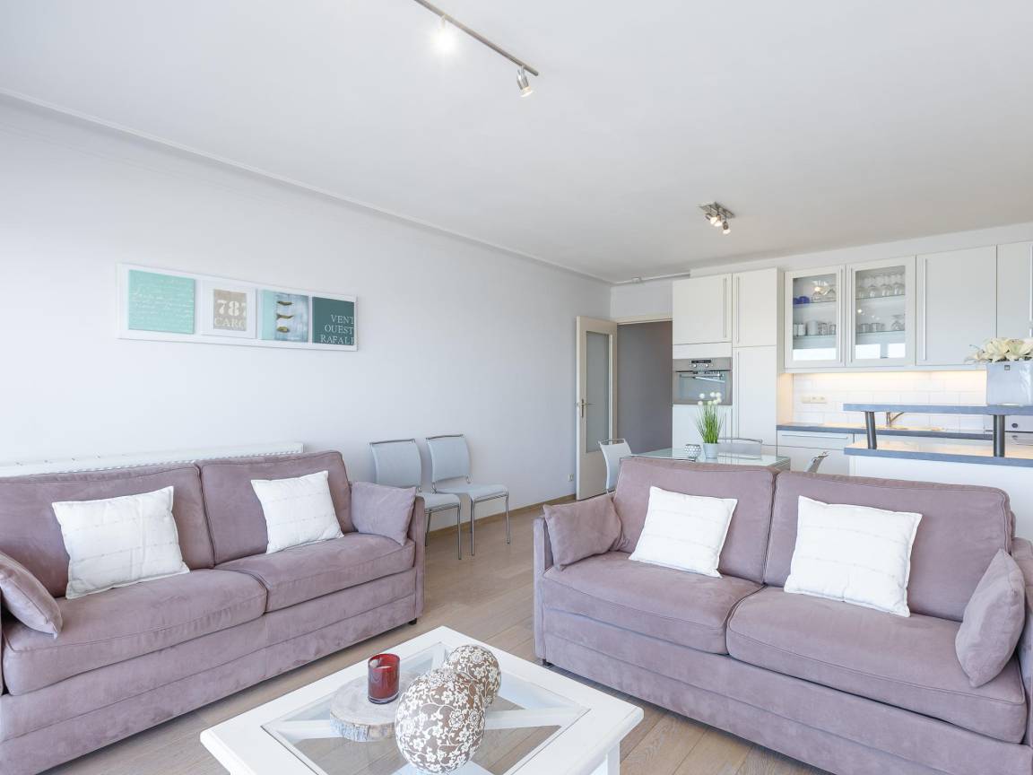 Hausbeschreibung : Gemütliches Studio im 4. Stock, ideal für 2 Personen. Schrankbett für 2 und heller Wohnbereich mit sonniger Terrasse und schönem Meerblick. Moderne, voll ausgestattete Küche und Bad mit Badewanne und WC. Direkt an der Promenade, nahe Tram, Geschäften und Restaurants. Parkplatz inklusive. Schwimmbad und Cafeteria im Gebäude.