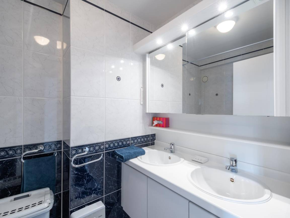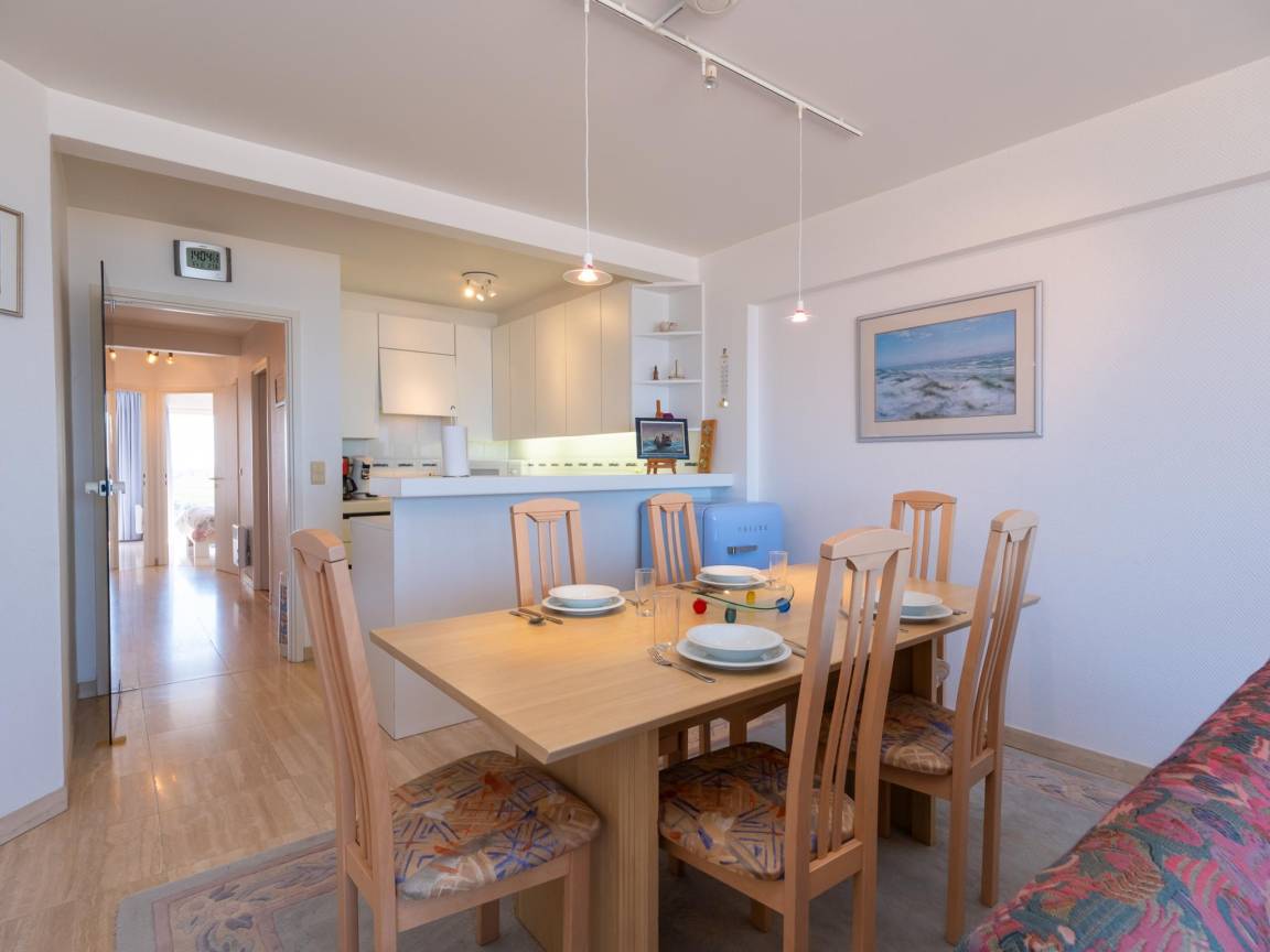 Hausbeschreibung : Wohnung im 8. Stock mit 2 Schlafzimmern. Geräumiges, helles Wohnzimmer mit Terrasse und Meerblick. Voll ausgestattete offene Küche. Beide Schlafzimmer haben Zugang zur sonnigen Terrasse hinten mit freiem Blick. Abstellraum mit Waschmaschine/Trockner, Bad mit Badewanne und separates WC. Toplage nahe Geschäften, ÖV und dem neuen Casino. Achtung: Garage nicht zugänglich vom 01.02.26 bis 30.06.26.