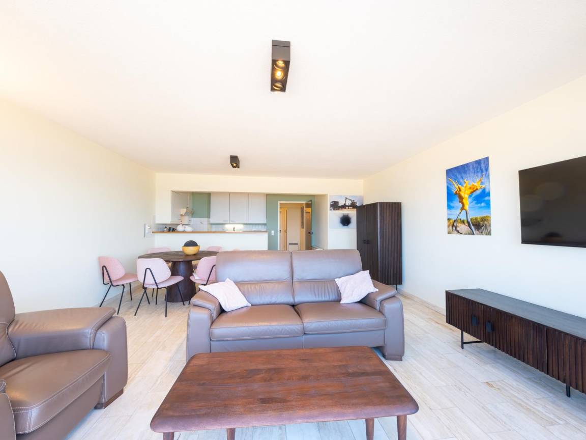 Hausbeschreibung : Wohnung im 5. Stock mit 2 Schlafzimmern (jeweils mit Doppelbett), ideal für Familien oder Paare. Helles Wohnzimmer mit großen Fenstern und Terrasse mit Meerblick. Offene, ausgestattete Küche, renoviertes Badezimmer mit Dusche und separatem WC. Sonnige Terrasse auf der Rückseite mit Blick ins Hinterland. Parkplatz nicht zugänglich vom 01.04 bis 30.06.26. WLAN: ja. Parkplatz: nicht inbegriffen. Bettwäsche/Handtücher bitte selbst mitbringen.