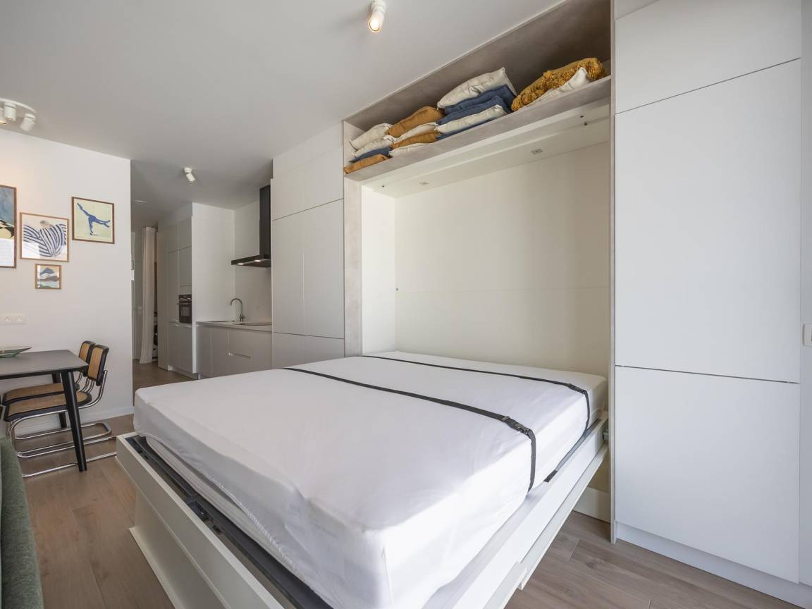 Hausbeschreibung : Gemütliches Retro-Studio für 2 Personen im 2. Stock eines Neubaus. Praktisch und stilvoll eingerichtet mit offener, voll ausgestatteter Küche, Bad mit begehbarer Dusche und WC. Klappbett für mehr Raumgefühl. Ostterrasse mit Morgensonne, Abstellraum und Waschmaschine vorhanden. Residenz mit historischer Fassade und modernem Design, nahe Geschäften, Tram, Casino und Strand.