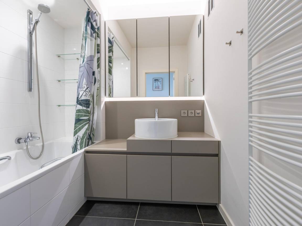 Layout : In der 6. Etage: Wohnzimmer mit Doppelschlafcouch(Doppelbettdecke, 160 x 200 cm), TV, Esstisch, Radio , Küche mit Wasserkocher, Toaster, Kaffeemaschine(Filter), Backofen, Mikrowelle, Geschirrspüler, Kühlschrank, Kühl-/Gefrierkombination, Zitruspresse , Schlafzimmer mit Doppelbett(Doppelbettdecke, 160 x 200 cm) , Schlafzimmer mit 2x Etagenbett(Bettdecke, 90 x 200 cm) , Badezimmer mit Dusche , Badezimmer mit Badewanne , Toilette
