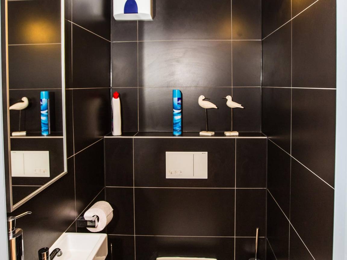 Layout : In der 6. Etage: Wohnzimmer mit TV, Esstisch , Küche mit Kaffeemaschine(Filter), Backofen, Mikrowelle, Geschirrspüler, Kühlschrank, Zitruspresse , Schlafzimmer mit Doppelbett(Doppelbettdecke, 160 x 200 cm) , Schlafzimmer mit Doppelbett(Doppelbettdecke, 140 x 200 cm) , Badezimmer mit Dusche , Toilette, Abstellraum