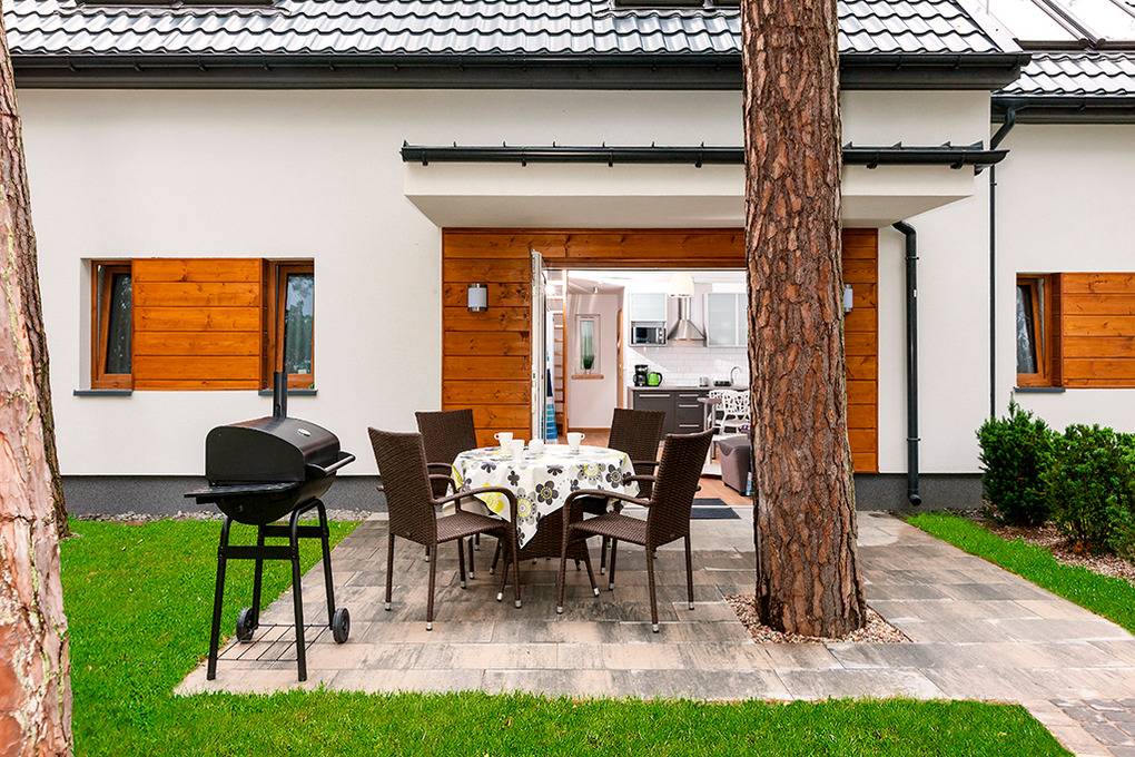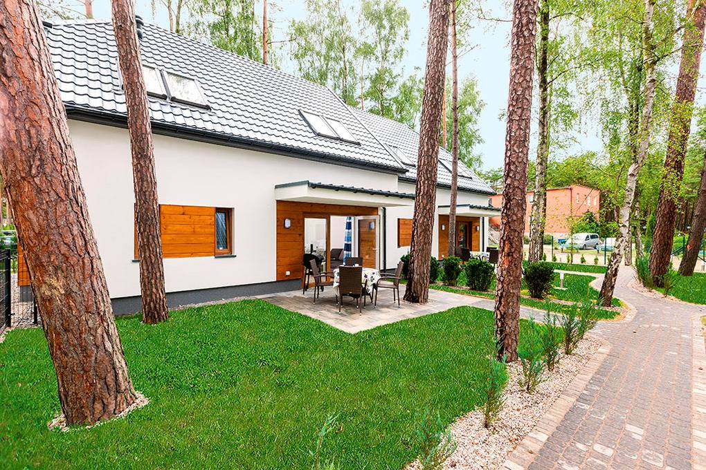 Haus: Schöne, gepflegte Ferienhausanlage auf einem umzäunten Grundstück am Waldrand. Komfortable Reihenhäuser, 2016 neu erbaut, mit geschmackvoller, moderner Einrichtung. Fußbodenheizung, E-Radiatoren. Warmwasser über E-Boiler (80 l). Terrasse, teilweise überdacht, davor kleiner Garten mit Rasenfläche. In der Anlage: Kinderspielplatz (Sandkasten, Schaukel, Klettergerüst, Rutsche). 1 Pkw-Stellplatz/Ferienhaus.