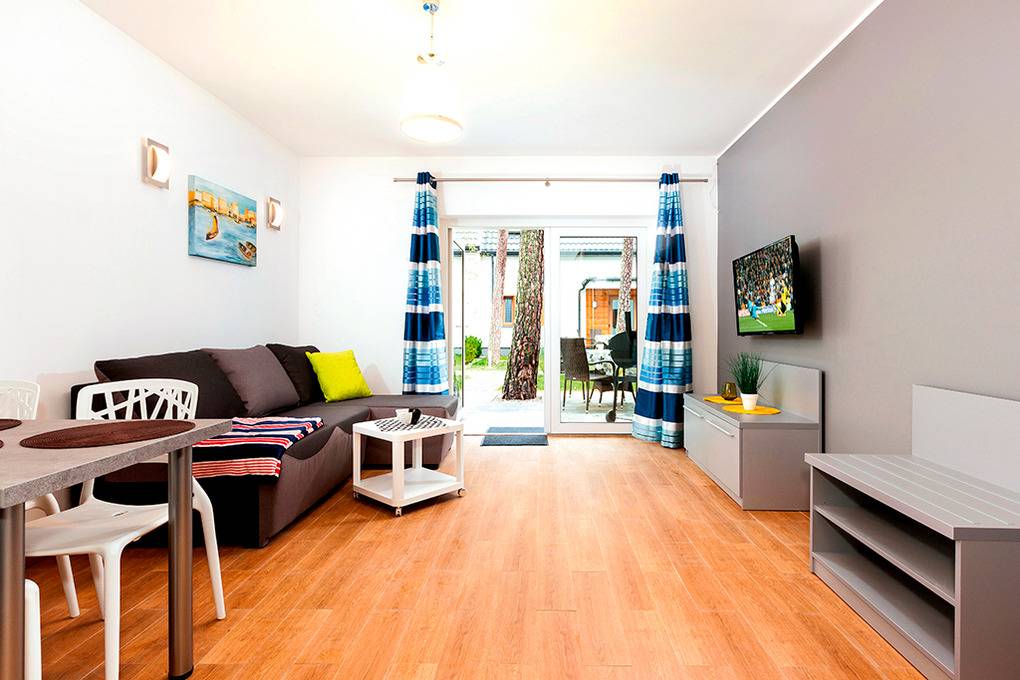 PL 13.3 Ferienhaus 2-6 Pers.: 3-Zimmer-Reihenhaus mit 55 qm Wohnfläche über 2 Etagen. Parterre: Großzügiger Wohn-/Essraum mit Ecksofa (Ausziehcouch 2 Pers.), Sat-TV (deutsche Programme), Internet (W-Lan), Esstisch, moderner Küchenzeile (2 E-Platten Ceranfeld, Abzugshaube, Mikrowelle, Spülmaschine). Bad/WC. 1. Etage: Doppelzimmer. 2-Bettzimmer. Terrasse mit Sitzmöbeln, Grill.