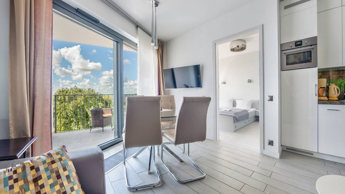 Horyzont ist eine moderne und komfortable Anlage, gelegen in der ul. 1000-lecia Państwa Polskiego 8 in Międzyzdroje. Die Apartments befinden sich in einer ruhigen, grünen Umgebung, was sie zu einem idealen Ort für Erholung fernab vom städtischen Trubel macht. In der Nähe liegt ein wunderschöner Park, und die kurze Entfernung zum Strand ist ein weiterer Vorteil dieser Lage.