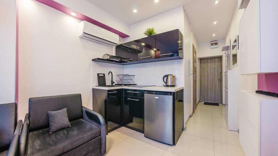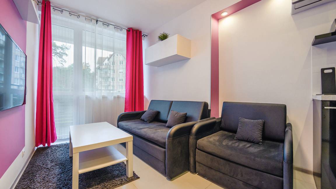 • Haustiere sind in der ausgewählten Wohnung erlaubt. Die Kosten für den Aufenthalt mit einem Haustier betragen 40 PLN pro Tag.