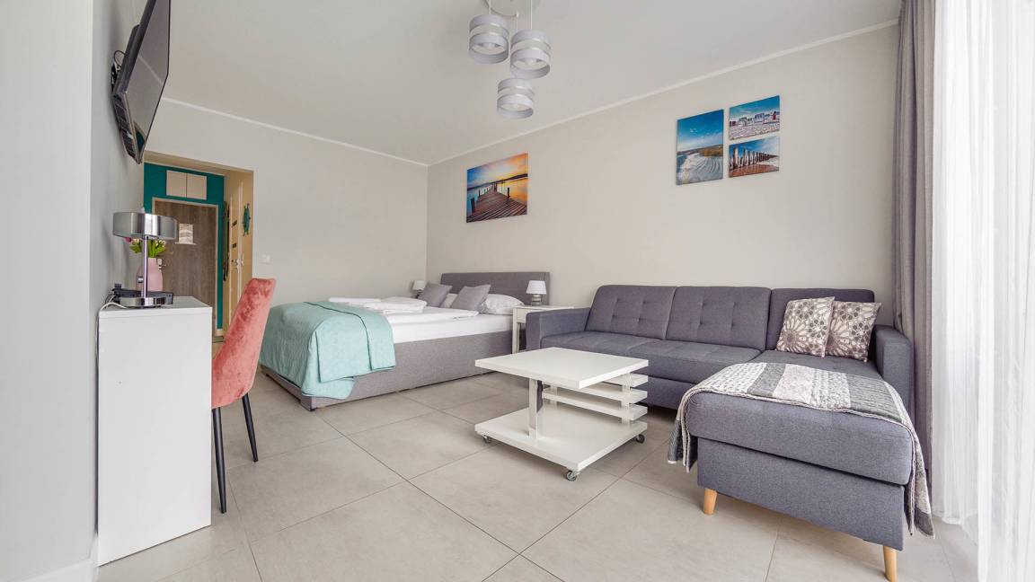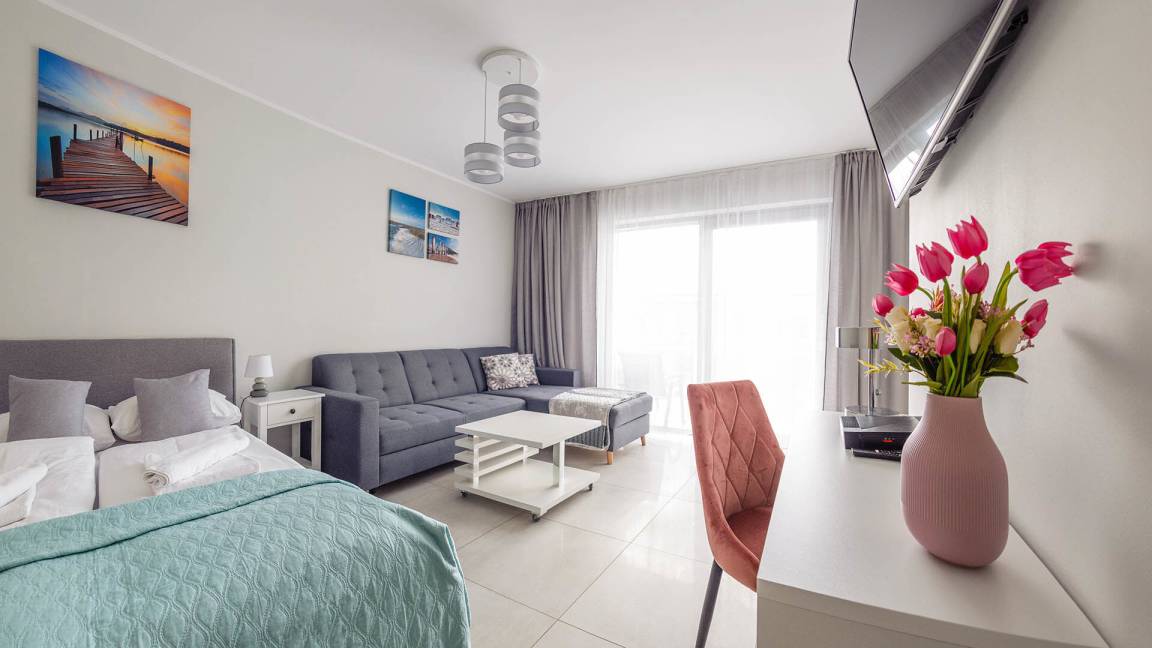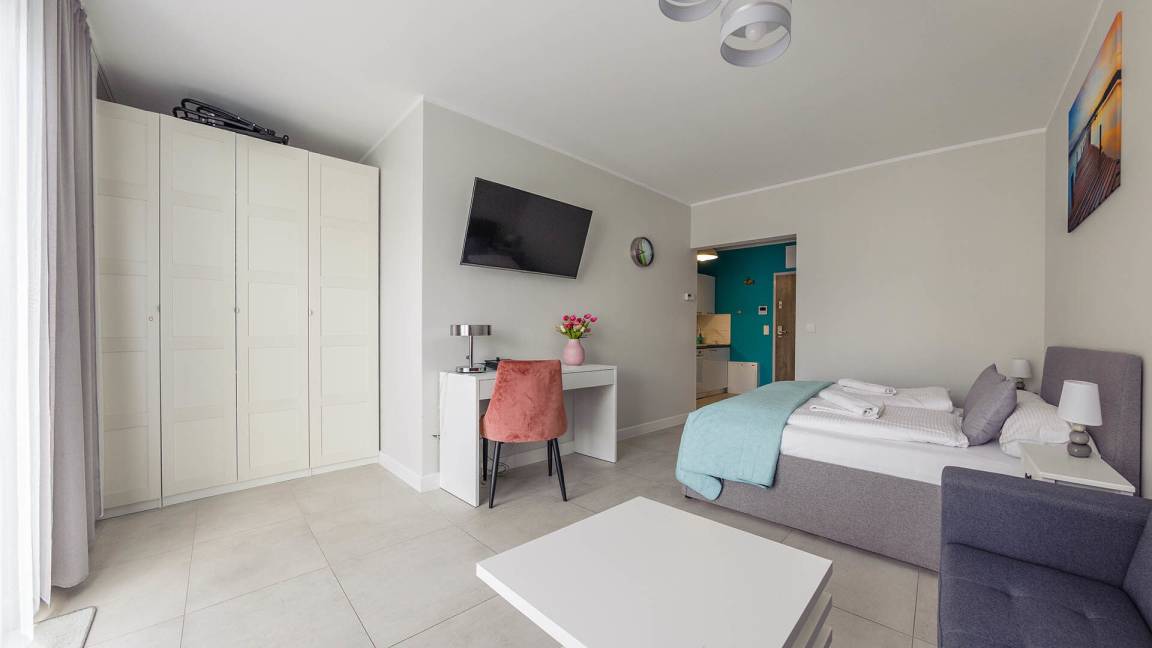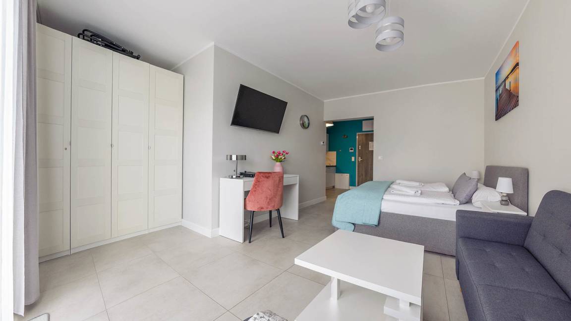 • Haustiere sind in der ausgewählten Wohnung erlaubt. Die Kosten für den Aufenthalt mit einem Haustier betragen 40 PLN pro Tag.