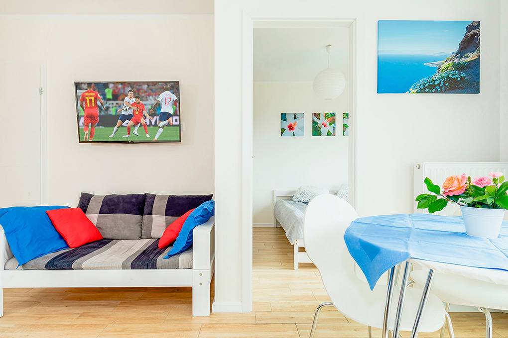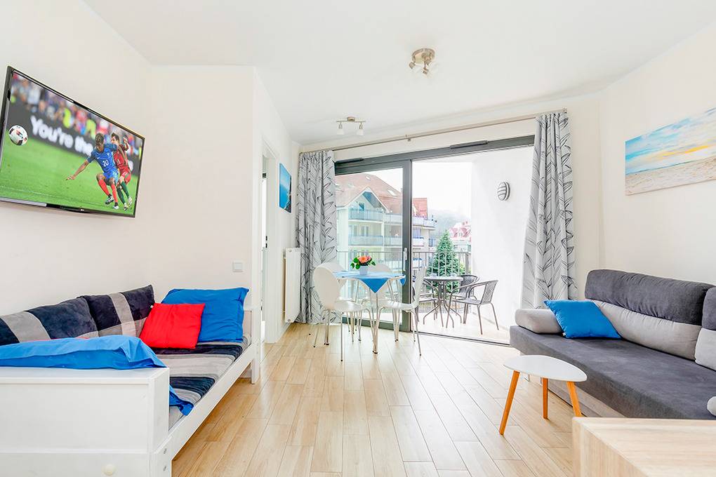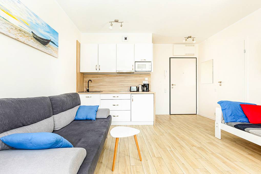 PL 10.14 Wohnung 2-4 Pers.: Stilvolle 2-Zimmerwohnung mit 36 qm Wohnfläche, 2. Etage (Aufzug). Schöner Wohn-/Essraum mit 2 Sofas (davon 1 Schlafsofa für 2 Pers.), Flachbild Sat-TV (deutsche Programme), Internet über Wi-Fi, Esstisch, Küchenzeile (2 Induktionsplatten, Abzugshaube, Mikrowelle). Doppelzimmer. Bad/WC. Großer Südbalkon mit Sitzmöbeln.