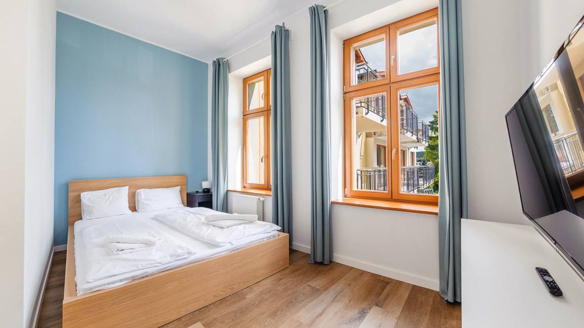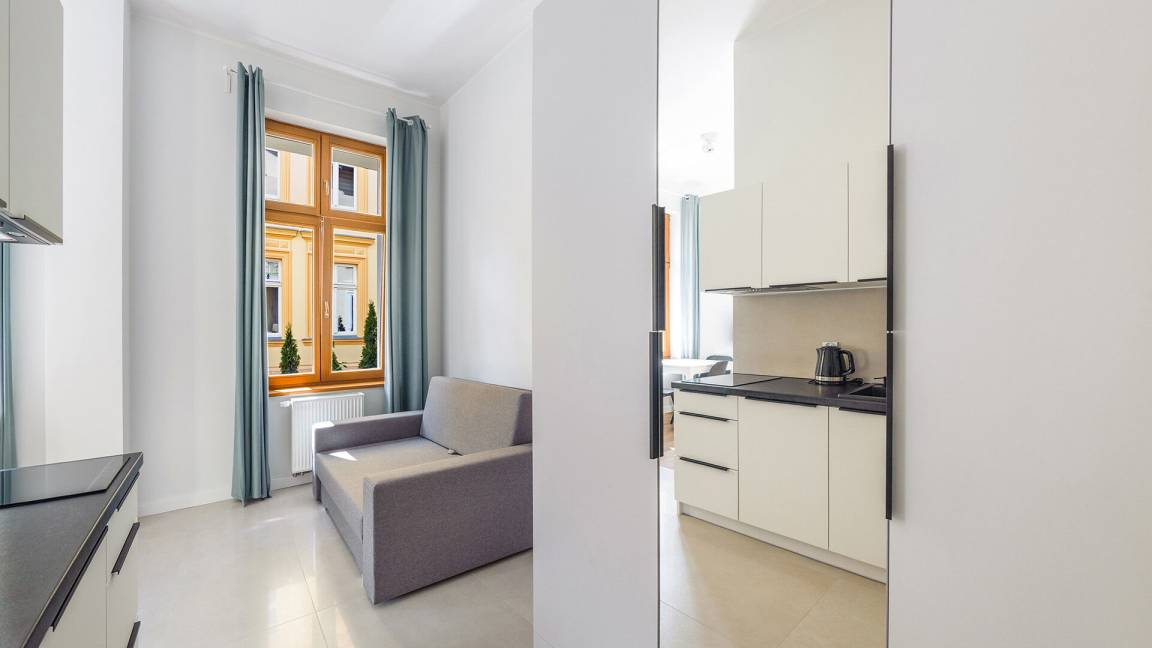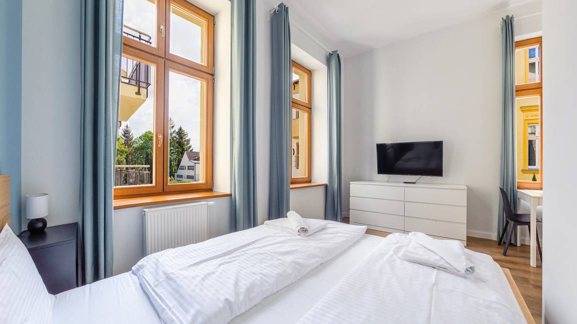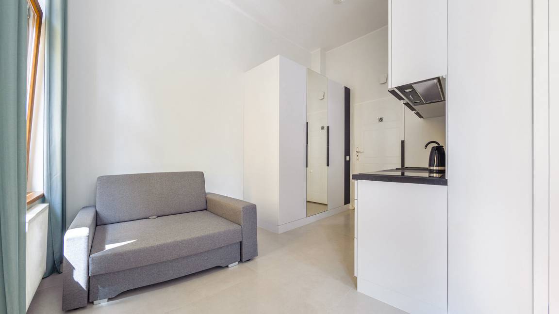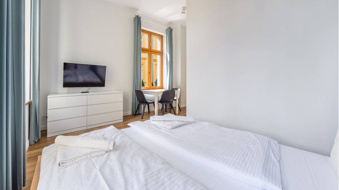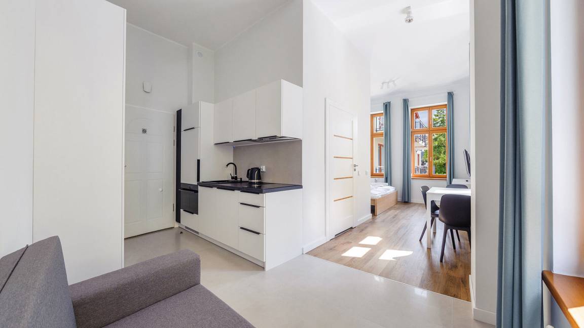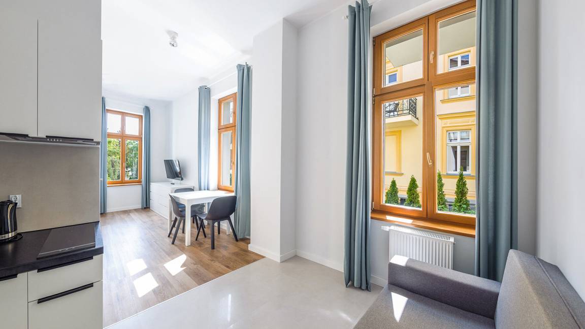 • Haustiere sind in der ausgewählten Wohnung erlaubt. Die Kosten für den Aufenthalt mit einem Haustier betragen 40 PLN pro Tag.