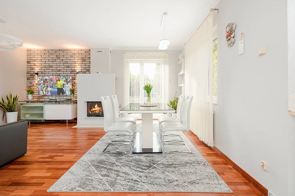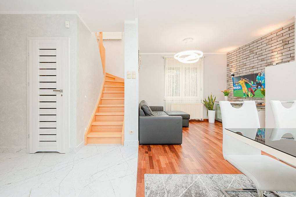 PL 60.8 Ferienhaus 1-8 Pers.: Komfortables 4-Zimmerhaus mit 80 qm Wohnfläche über 2 Etagen. Parterre: Schöner Wohn-/Essraum mit modernem Kamin, Sitzgarnitur (4 Ausziehcouch 2 Pers.), Flachbild Sat-TV (deutsche Programme), Play-Station, Esstisch, moderner Küchezeile (E-Herd 4 Pl., Abzughaube, Backofen, Spülmaschine). 2-Bettzimmer. Abstellkammer mit Tiefkühltruhe, Waschmaschine, Trockner. Bad: Du, Wb, WC. 1. Etage: Doppelzimmer mit Sat-TV (deutsche Programme). 4-Bettzimmer mit Ecksofa (Ausziehcouch 2 Pers.), Sat-TV (deutsche Programme), Schlafcouch (2 Pers.). Bad: Bw/Handdusche, Wb, WC.