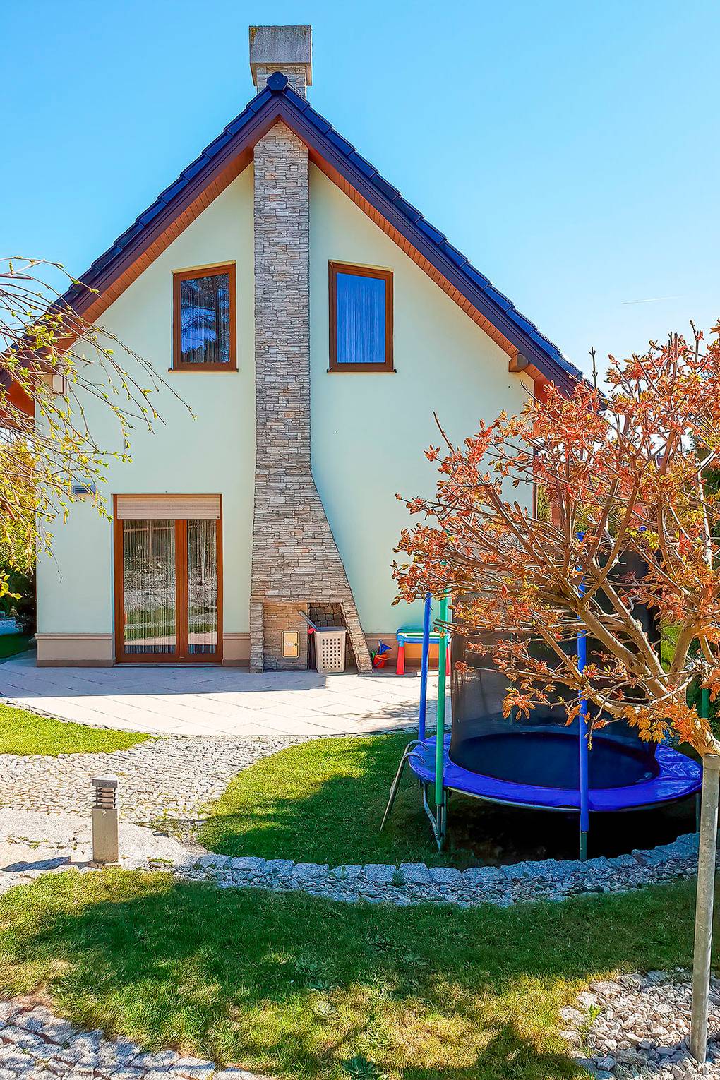 Haus: Sehr schönes, großzügiges Ferienhaus mit Kamin auf einem großen, gepflegten Gartengrundstück (500 qm). Moderne, geschmackvolle Einrichtung. 2 Bäder. 3 Schlafzimmer, davon 2 mit Sat-TV. Kostenloser Internetzugang über W-Lan. Nichtraucherhaus. Zentralheizung, teils Fußbodenheizung. Große Terrasse mit schönem Natursteinboden, Sitzmöbeln, Grill. Kleiner Kinderspielplatz mit Rutsche, Trampolin. 2 große, 2 kleine Fahrräder vorhanden. 2 Pkw-Stellplätze auf dem umzäumten Grundstück.
