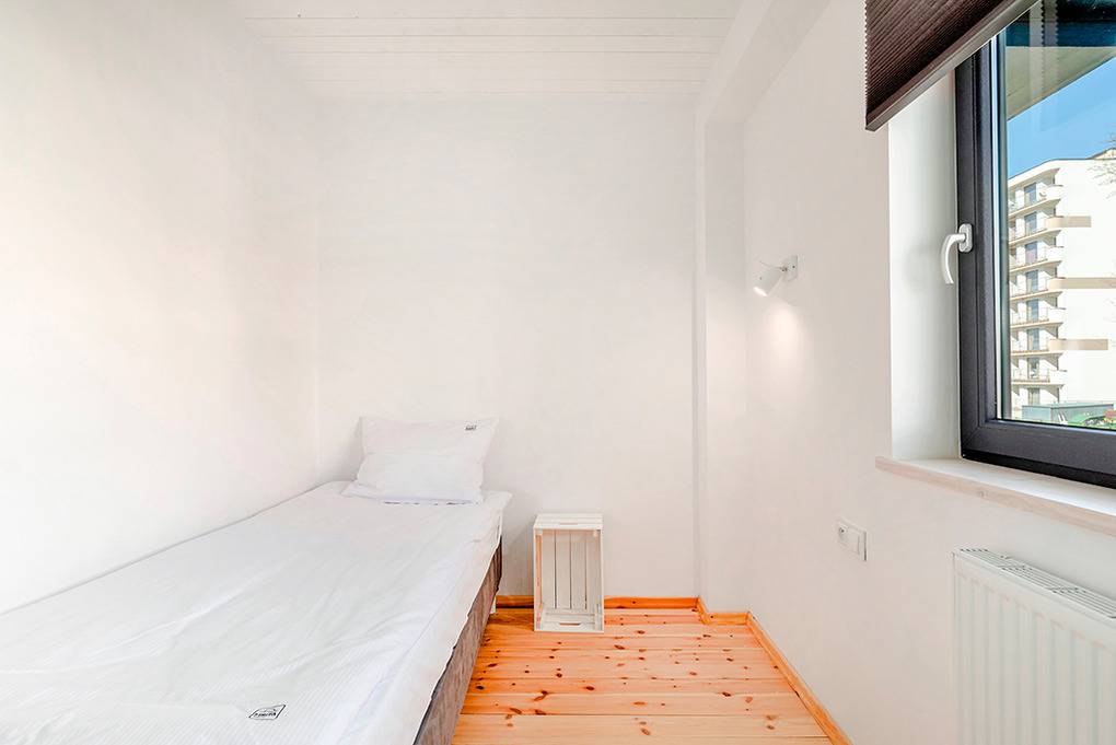 PL 61.6 Ferienhaus 1-4 Pers.: Gepflegtes 3-Zimmer-Reihenhaus mit 45 qm Wohnfläche über 2 Etagen. Parterre: Wohn-/Essraum mit schöner Holzbalkendecke, Couchgarnitur, Flachbild Sat-TV, Esstisch, Küchenzeile (2 Induktionsplatten, Mikrowelle, Tiefkühlfach 30 l). Modernes Bad: ebenerdige Dusche, Wb, WC. 1. Etage: Doppelzimmer mit Balkon. 2-Bettzimmer. Terrasse mit Sitzmöbeln.
