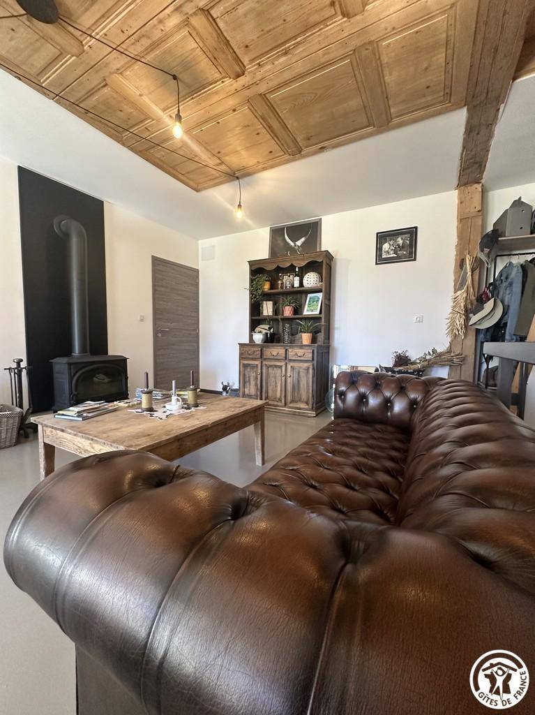 Das Ferienhaus ist groß, komfortabel und komplett ausgestattet. Nach dem Durchqueren der Eingangshalle gelangen Sie in ein Wohnzimmer mit einem Sofa im Chesterfield-Stil und einem Kaminofen.