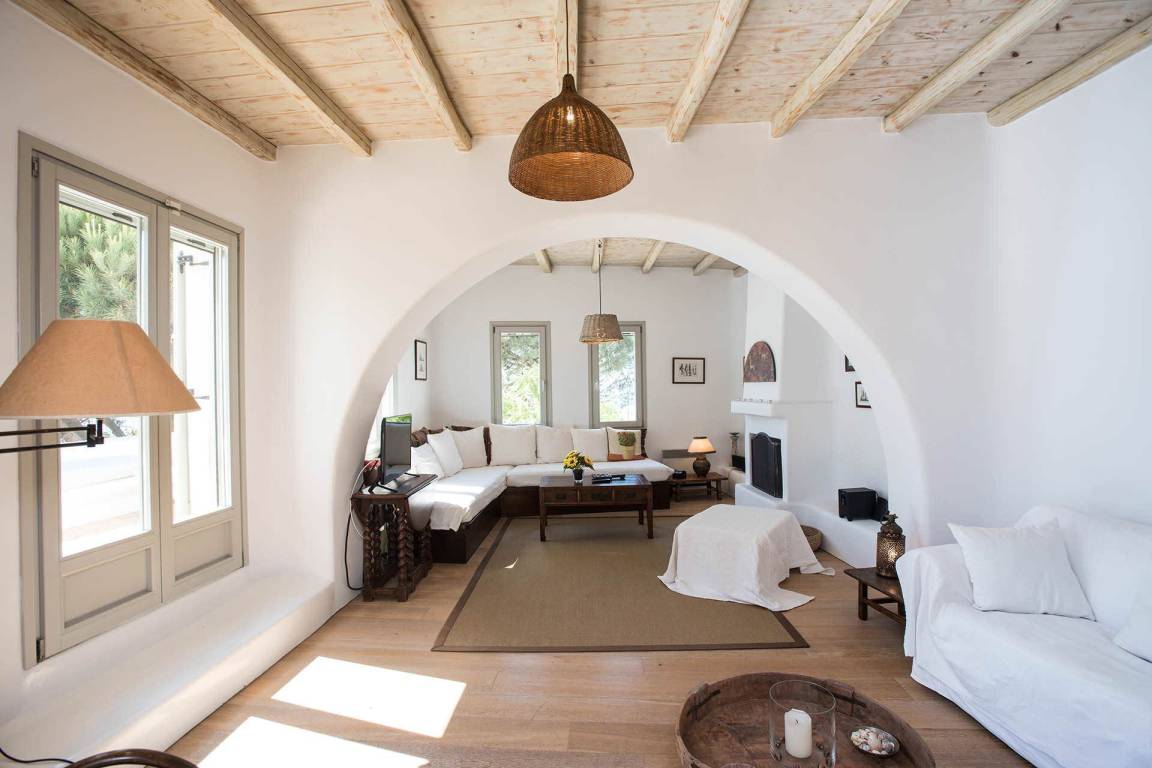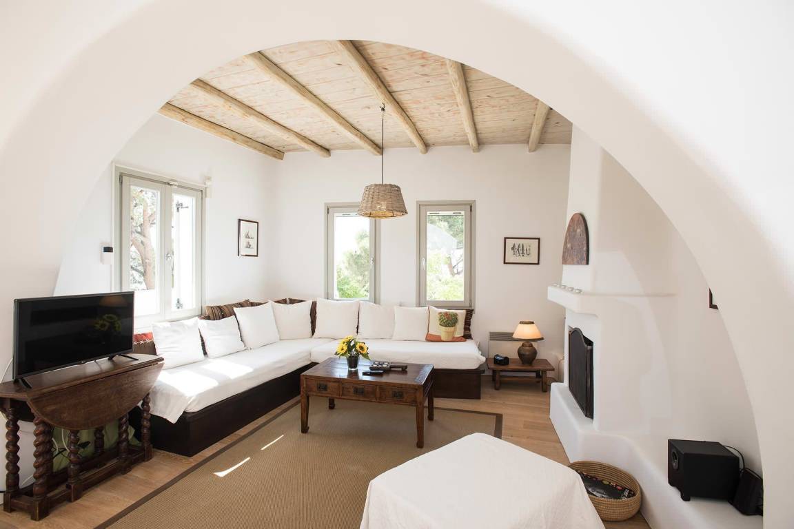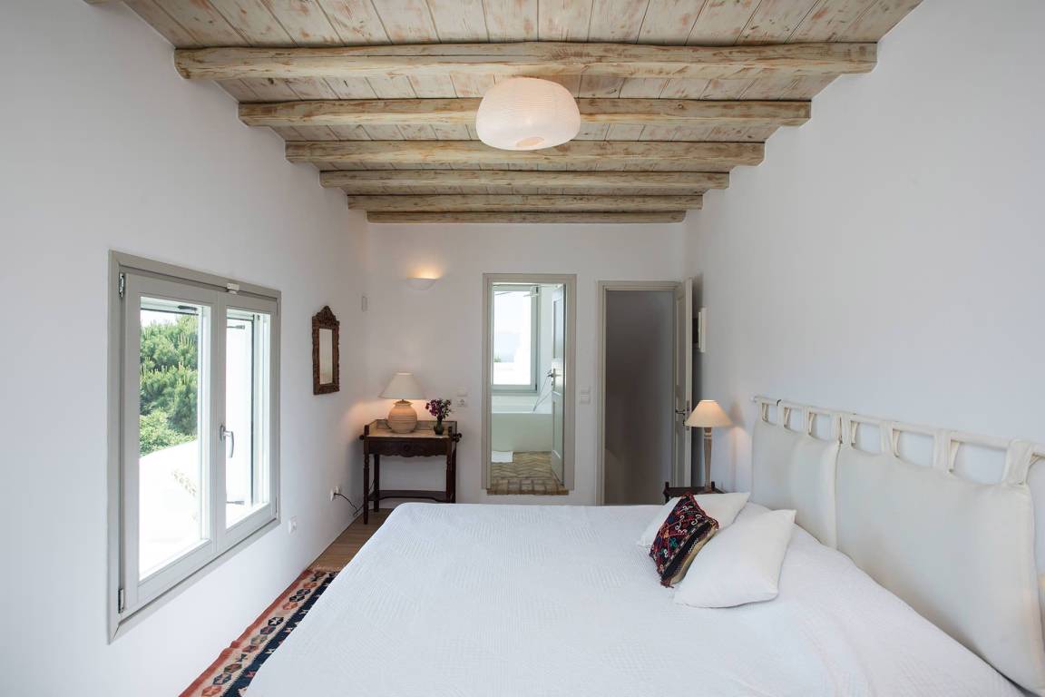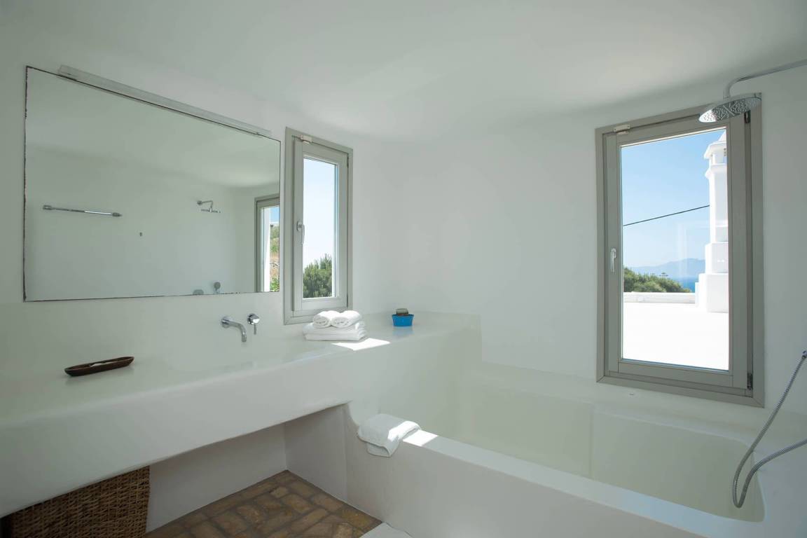 Die Villa erstreckt sich über mehrere Ebenen und bietet Platz für bis zu 10 Gäste in 5 Schlafzimmern und 5 Bädern. Die Schlafzimmer sind mit Bettenkonfigurationen für Paare und Familien ausgestattet. Die Wohnbereiche sind offen gestaltet und verbinden das Innere nahtlos mit den Außenbereichen. Die erhöhte Lage der Villa ermöglicht natürliche Lichtzufuhr und Meerblick aus den Haupträumen.