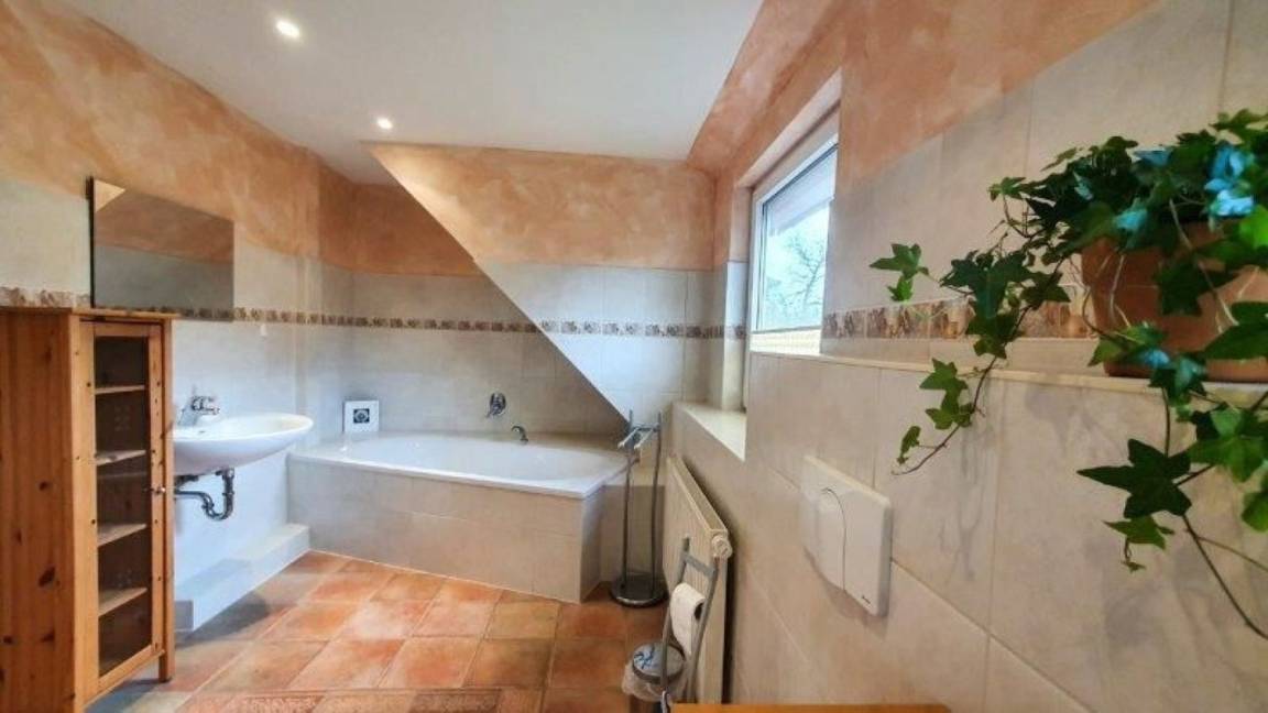 Drei Schlafzimmer und ein großes Bad mit Wanne und Dusche bilden das Obergeschoß. Zwei Schlafzimmer verfügen über große Doppelbetten, eines über ein Bett mit 1,2 Metern Breite. Es ist viel Schrankraum vorhanden, in dem Kleider und Wäsche für 6 Personen auch für einen langen Aufenthalt Platz finden.
