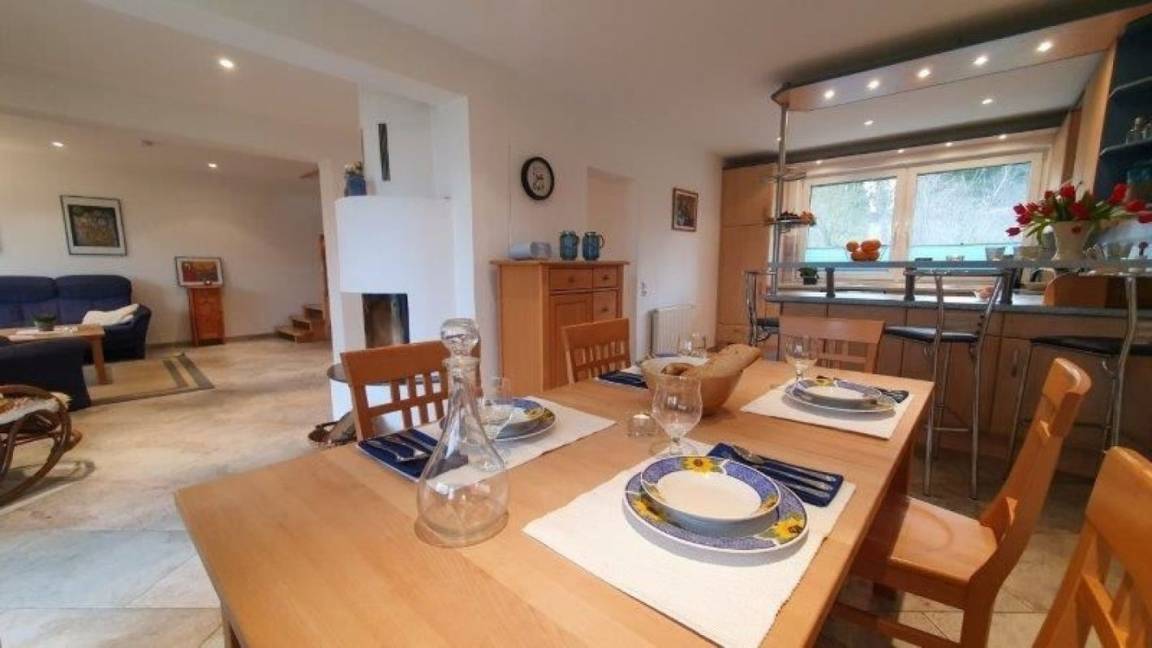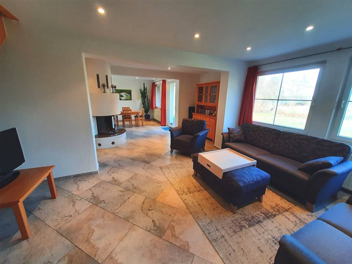 In unseren großem Haus Margerite mit mehr als 120 m² Wohnfläche finden bis zu 6 Personen Platz. Im Erdgeschoß befindet sich der große Wohnraum mit Kamin, Essecke und einer separaten aber zum Wohnzimmer / Essbereich offenen, komplett ausgestatteten Küche.