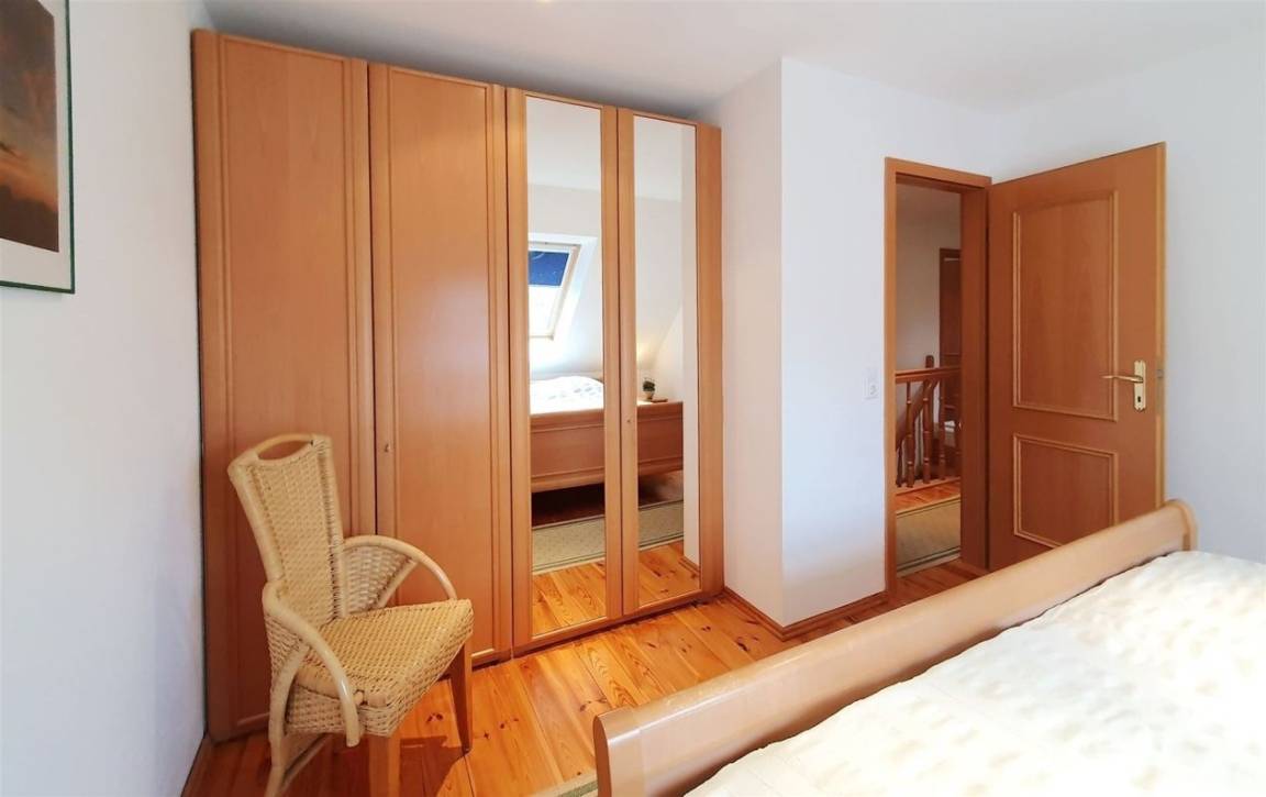 Im Obergeschoß befinden sich drei Schlafzimmer, eines mit einem großen Doppelbett, Kleiderschrank und einem Fenster mit Seeblick. Es gibt hier weitere zwei Schlafzimmer, eines mit einem großen Doppelbett und eines mit zwei Einzelbetten.