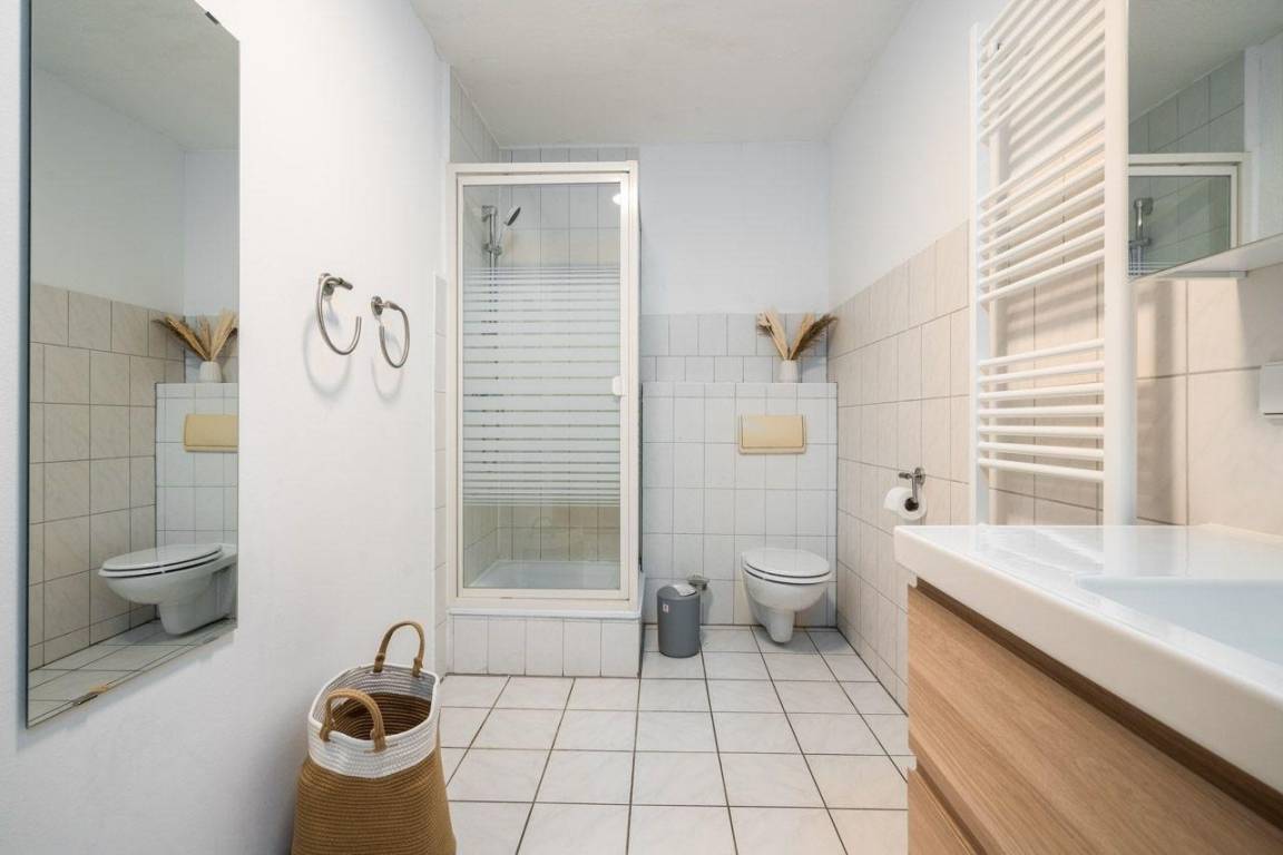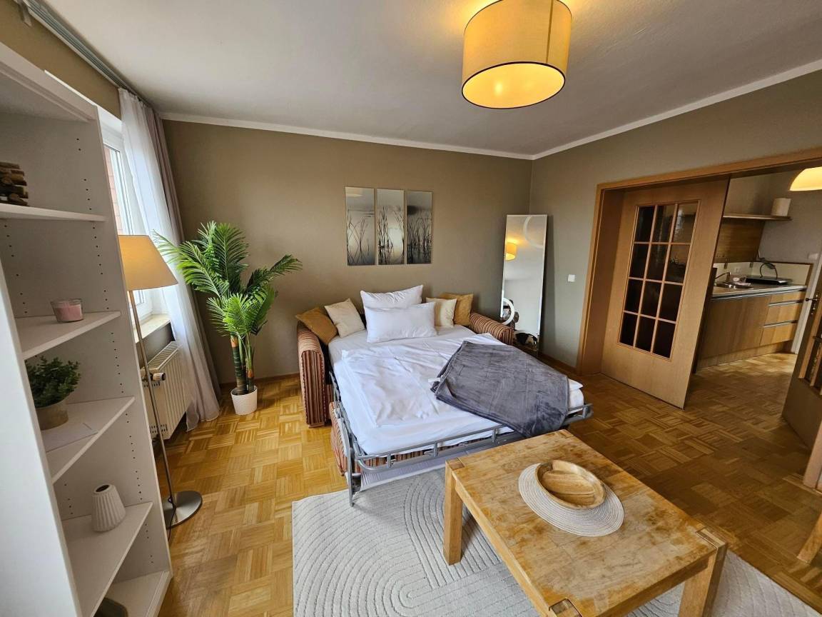 Die Ferienwohnung bietet Platz für bis zu vier Personen und zeichnet sich durch eine moderne und allergikergeeignete Ausstattung aus. Sie verfügt über ein ansprechendes Schlafzimmer mit einem komfortablen Doppelbett sowie ein Wohnschlafzimmer mit einem weiteren Doppelbett und einem einladenden Sofa. Die Küchenzeile ist mit allen erforderlichen Geräten ausgestattet, darunter ein Elektro-/Gasherd, Kühlschrank, Kaffeemaschine und Toaster. Ein Esstisch lädt zum gemeinsamen Essen ein. Das Duschbad ist mit einem Haartrockner und einem Starterset für Pflegeprodukte ausgestattet. WLAN ist im gesamten Bereich verfügbar. Für Familien steht ein Kinderhochstuhl und ein Kindertoilettensitz zur Verfügung. Die Wohnung ist barrierefrei zugänglich und verfügt über einen Fahrstuhl. Weitere Annehmlichkeiten sind ein Parkplatz, Gemeinschaftstools wie Brettspiele sowie eine HiFi-Anlage. Die gesamte Umgebung wird durch Fliegengitter und Rauchmelder sicher gestaltet. Ein Starterset für Reinigung und Hygiene ist ebenfalls vorhanden.